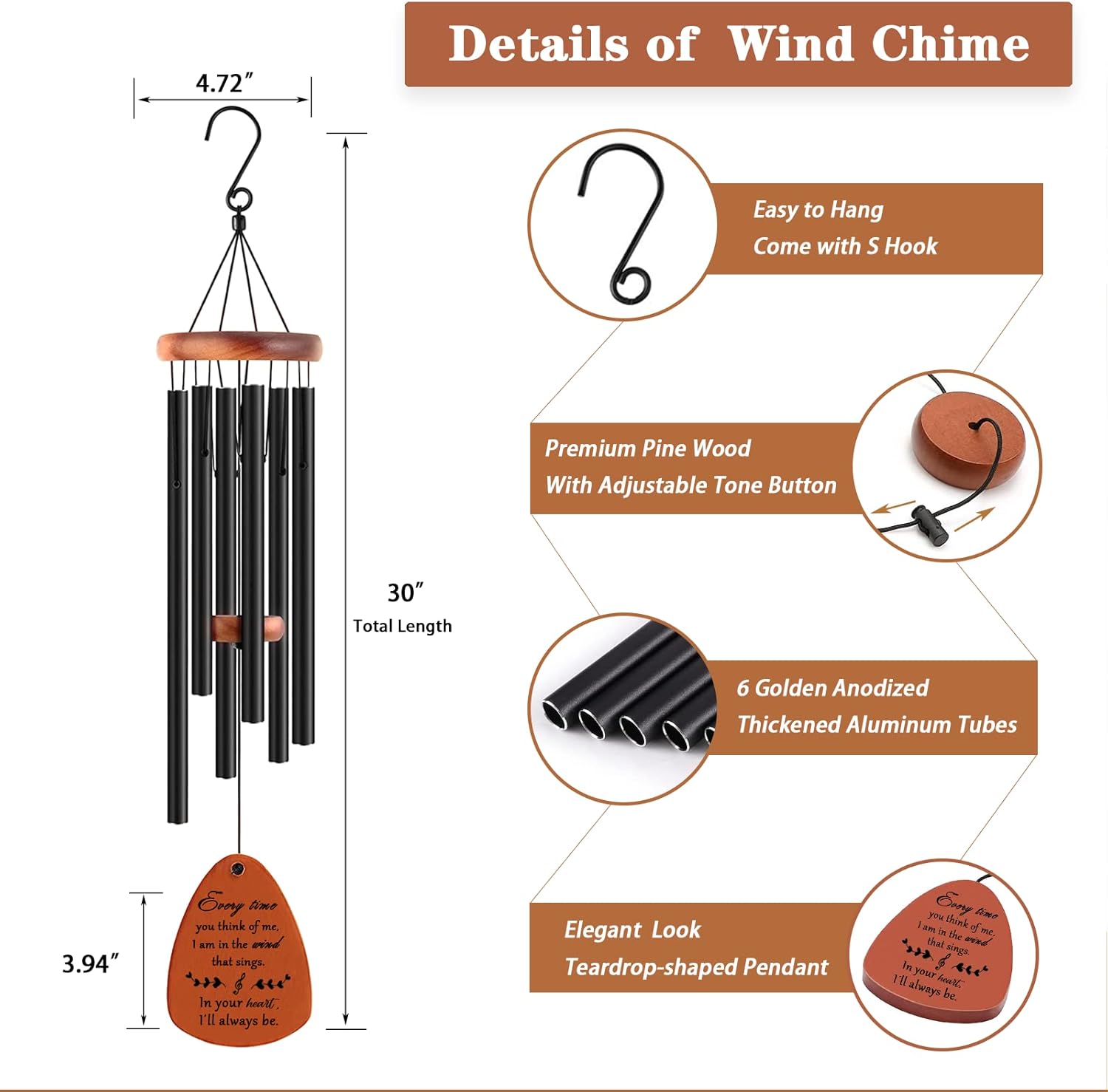 - Better Alternative than Flowers: Flowers will fade, but the memorial wind chimes will last a long time. This wooden wind chime is made of high-quality pine wood and 6 anodized aluminum tubes, making it lasting, waterproof, wear-resistant, and can endure all kinds of harsh weather.