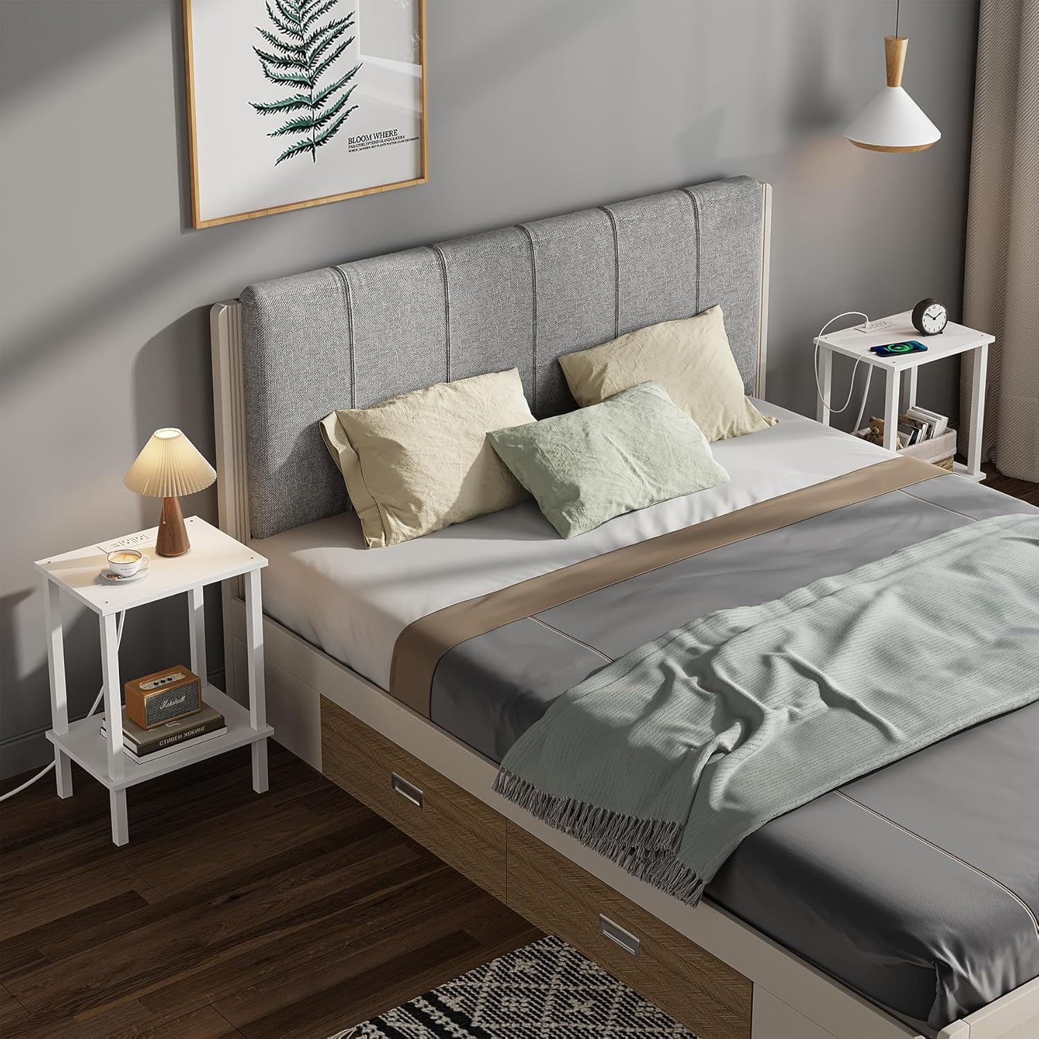 - [End Table with Charging Station] This side table with 2 AC outlets, 2 USB ports, and the 4.5 ft extension cord helps you charge your phone, tablet, lamp, and game console at the same time. Also, the distance between each outlet and port prevents adapters from blocking each other.