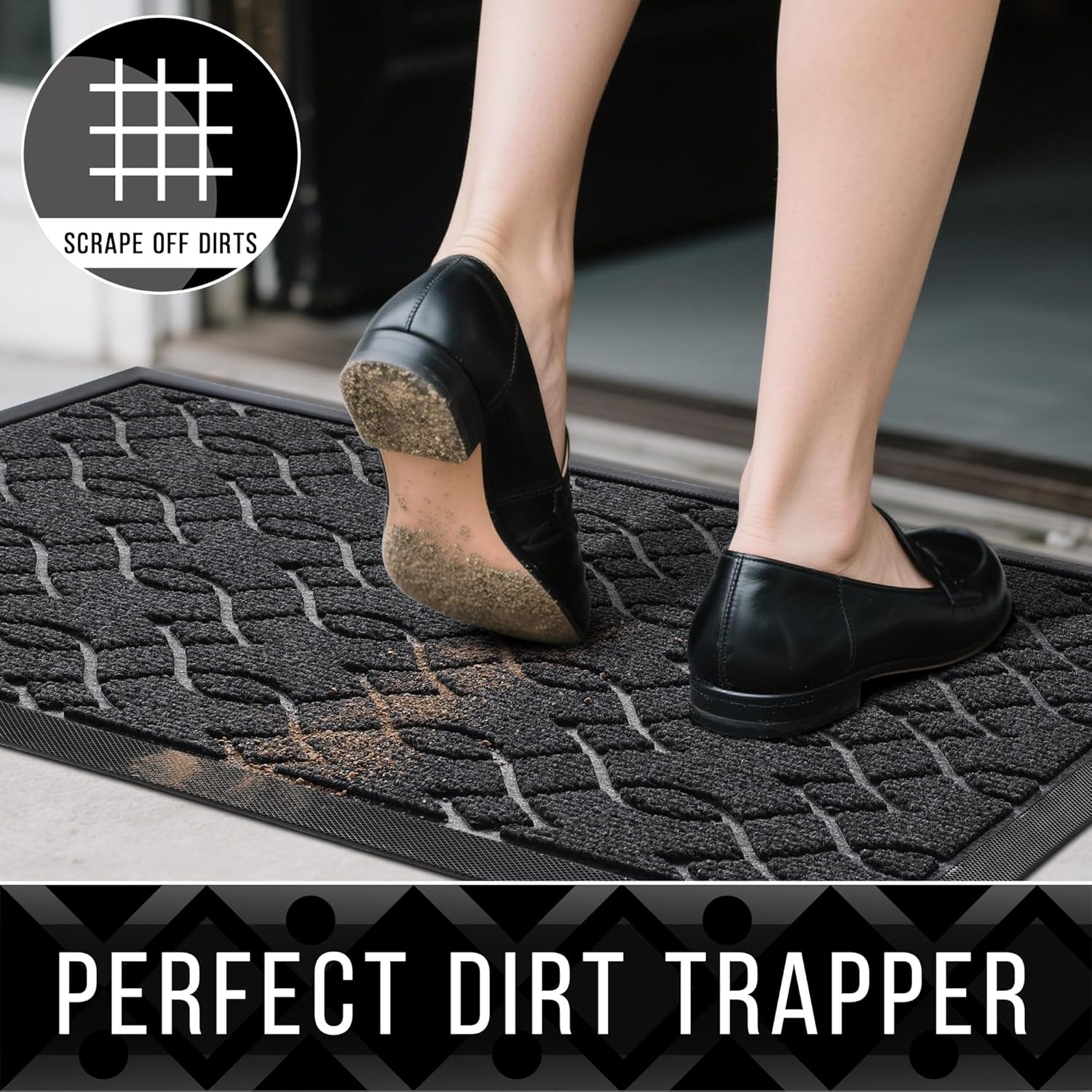 - 【Capture Dirt and Moisture】: Yimobra front door mat adopts heart striped groove design, forming a detention dam extending in all directions, helping to capture dirt, dust, gravel, mud, sand, grass or other messy debris and prevent them from entering Indoor; The surface of floor mat beautifully woven polyester fabric absorbs moisture, and the sturdy oblique rubber edge will not accumulate water in rainy and snowy days, keeping your home dry and clean