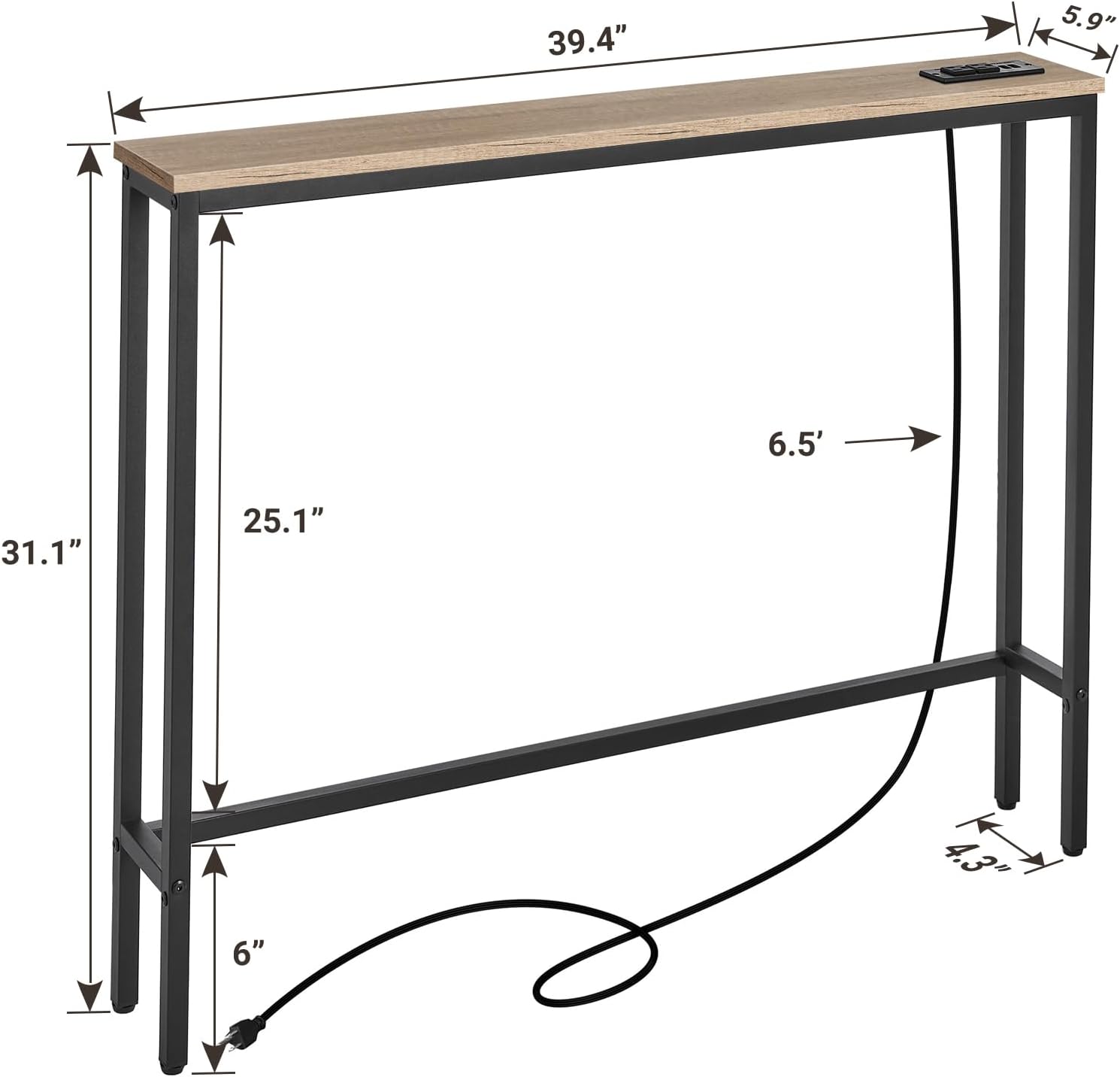 ELYKEN 5.9" Narrow Console Sofa Table with Power Outlets, 5.9" Dx39.4 Wx31.1 H Long Couch Table with Metal Frame and Charge Station with 6.5’ Extension Cord, White Oak
