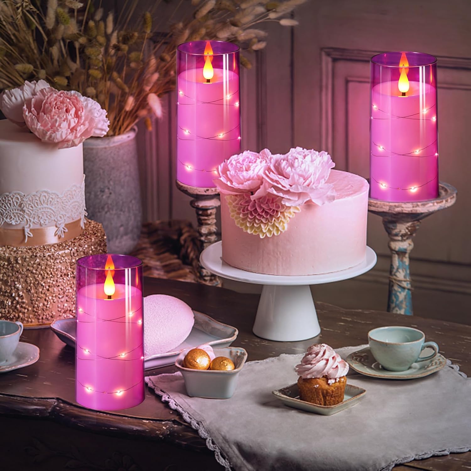 NURADA Flickering Flameless Candles: Built-in Star String Lights 3D Wick Acrylic Battery Operated LED Pillar Candles with Remote and Timer for Table Wedding Centerpieces Party 3 Pack Purple