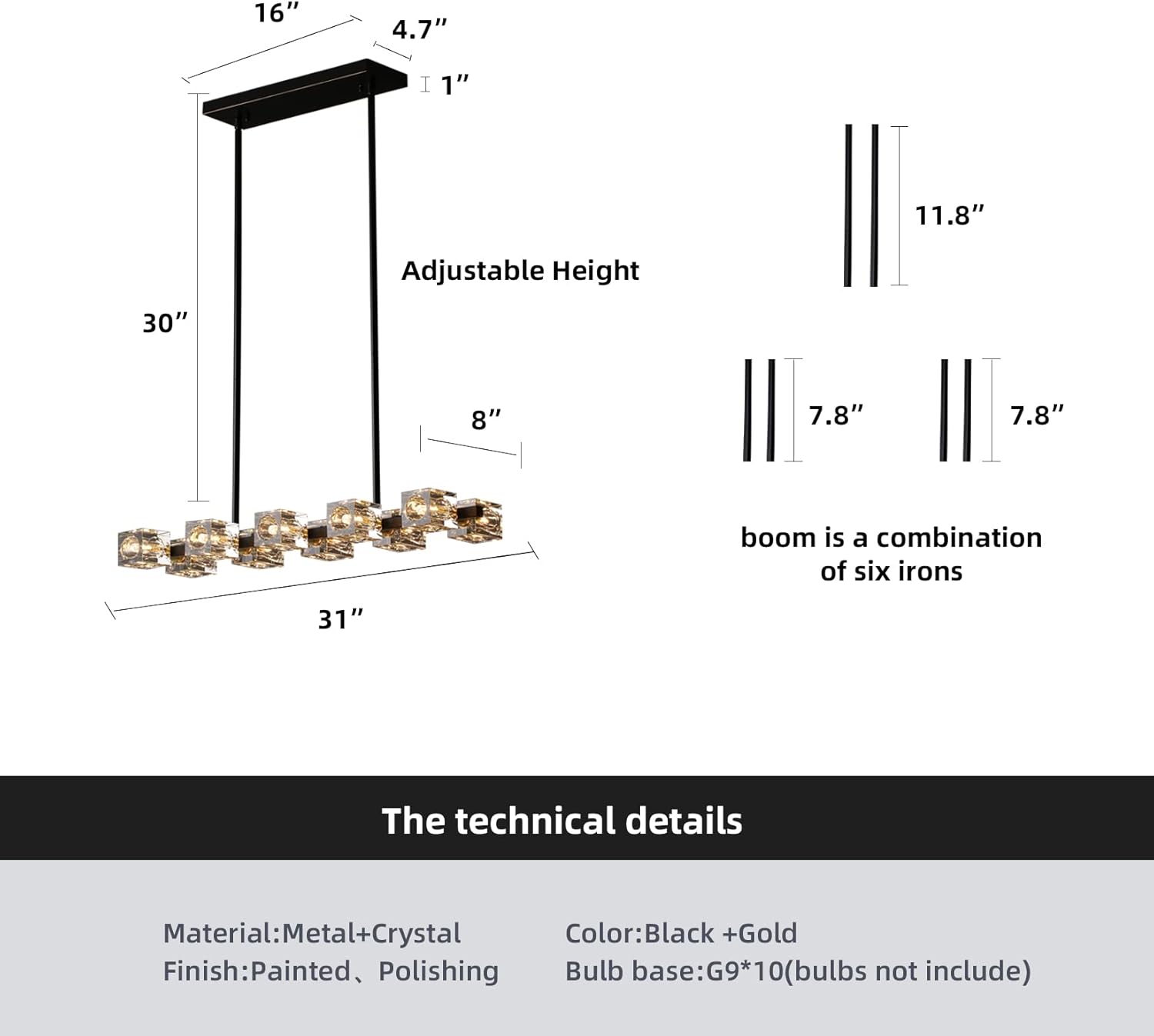 - 【K9 Crystal Material】The 10 lampshades of the ceiling light are made of clear K9 crystal,the lamp body is made of high-quality polished brass,the cube crystal lampshade is matched with G9 bulbs (bulbs are not included),and the crystal chandeliers reflects the bright light effect and projects it to the ceiling,making your home Reveals a low-key and elegant atmosphere,and modern black crystal chandeliers are perfect for dining room, kitchen island, living rooms, porches, and bedrooms at home