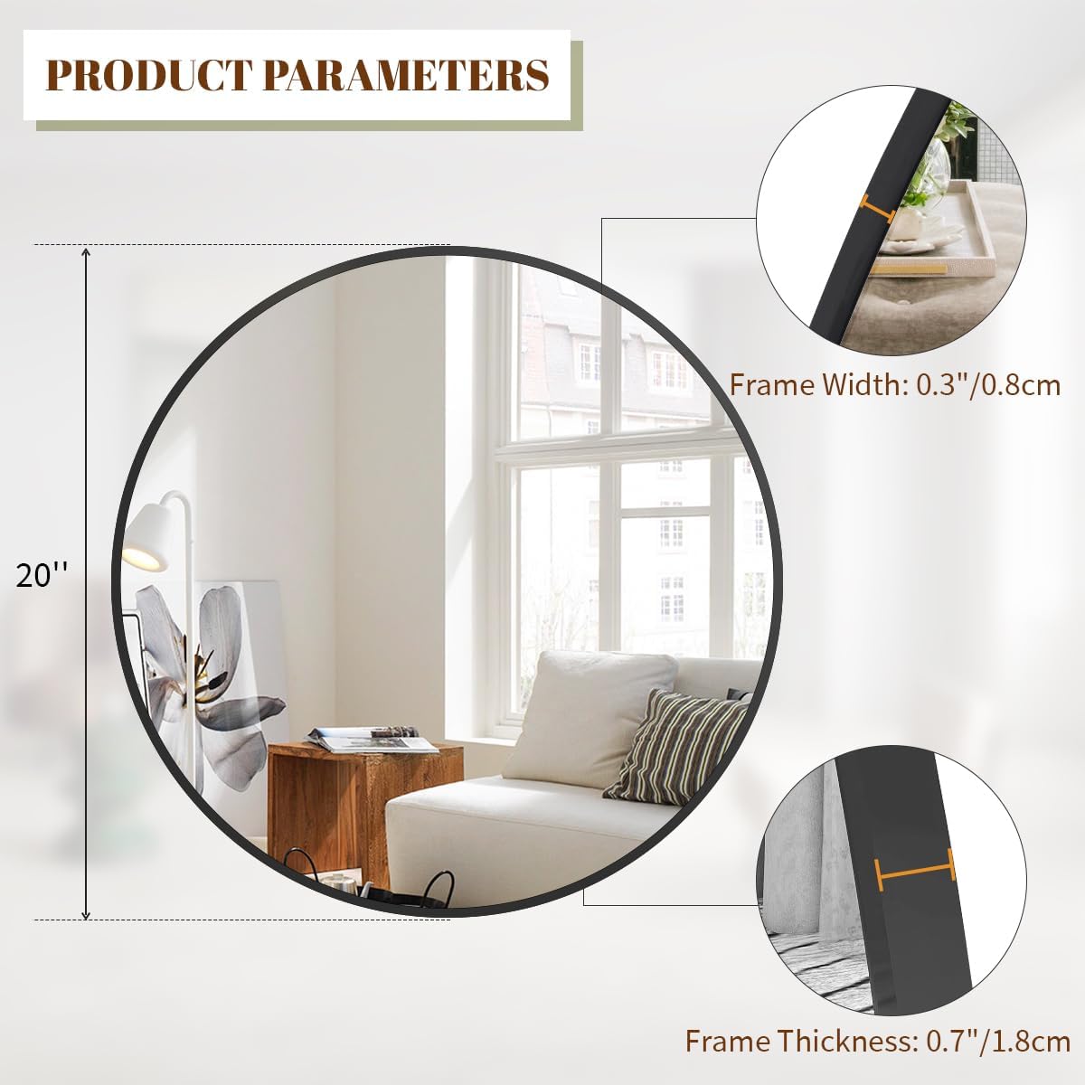 - Modern Brushed Frame Design: 20-inch black circle mirror is crafted of an aluminum alloy metal sleek frame, making it ideal for bathroom mirror, entrance mirror, vanity mirror, living room mirror