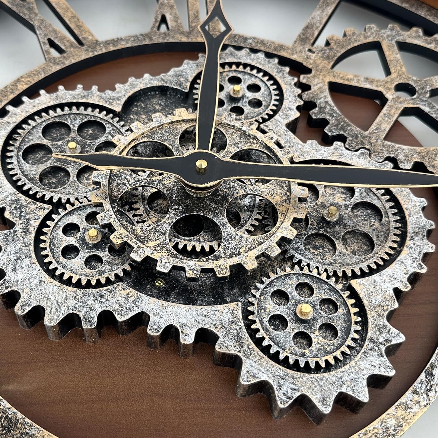 - 【Real Moving Gear Clock】All gears for the wall clock are real moving! Design with rustic bronze-color and industrial style. An creative combination of four gears for a retro look, has a very exquisite decorative effect makes the wall clock become a chic art works. The large wall clock crafted of nature wood & MDF. Big roman numeral numbers and wood rustic moving gears perfect for any room decor.