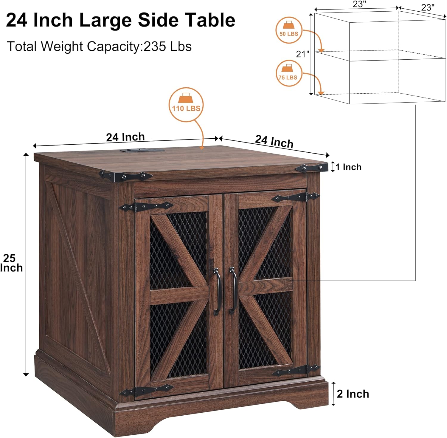 - 24 Inch Large Tabletop with Charging Station: Product Measured: 24" W × 24" D × 25"H. Design with a 24-inch square large tabletop allows you to place your laptop, cell phone, table lamp, and other daily necessities on the tabletop at the same time and without feeling crowded. What's more, this large end table for living room features AC power within arm's reach located on the top panel, allowing you to say goodbye to the trouble of finding a charging outlet. (2 AC outlets, 2 USB ports)