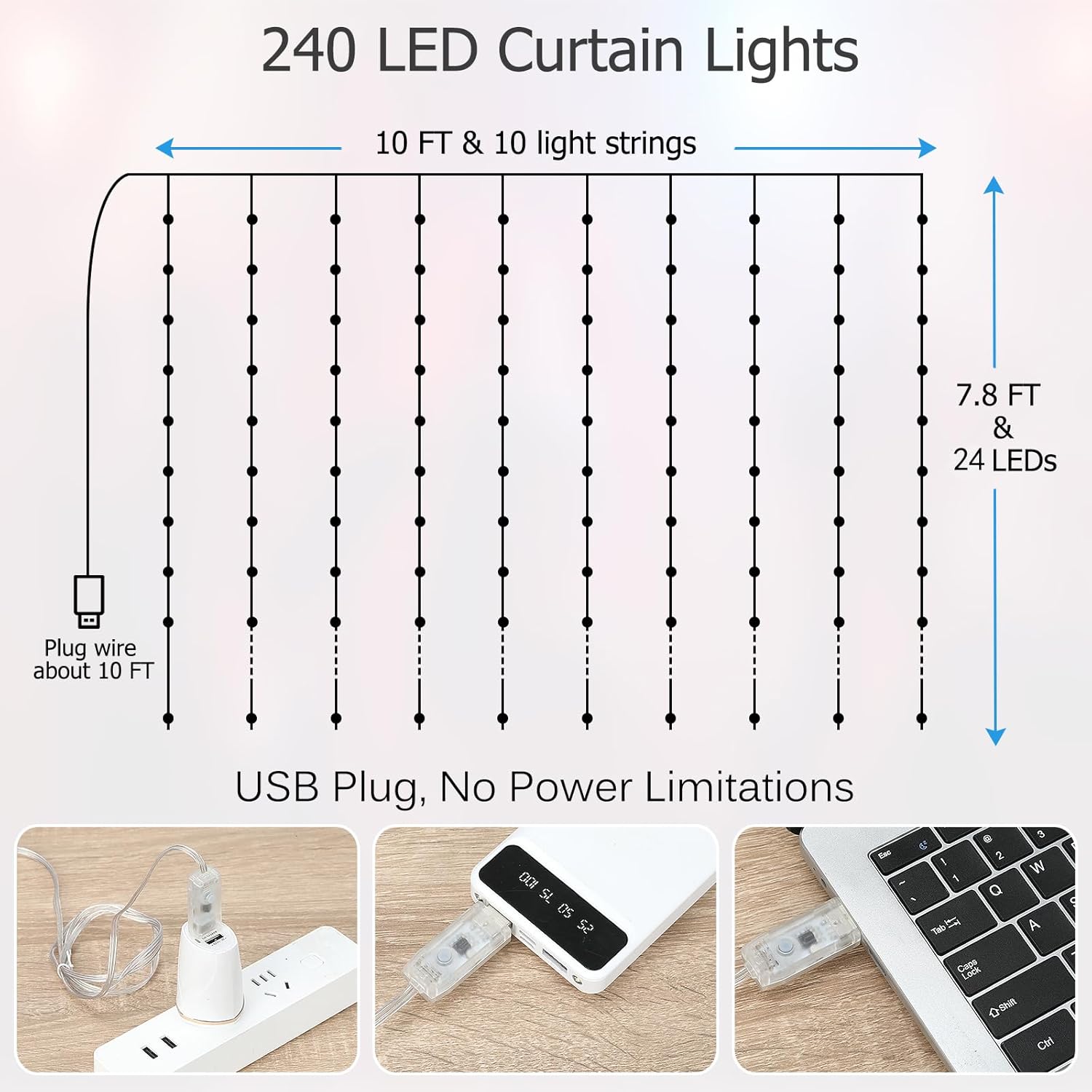 - Safe & Easy to Install: USB power means you can use window curtain lights anywhere, indoors and outdoors,plug in various USB power output device,such as USB charger, powerbank, laptop etc; With 10 equipped hooks, simple to hang it on any surface.