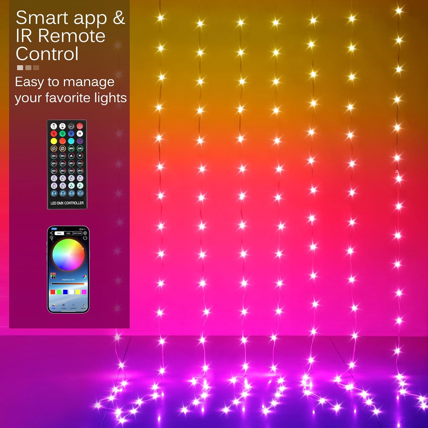 - Smart APP & IR Remote: Control the curtain string lights via Smart APP or IR remote, easily adjust Scene modes, brightness levels, speed levels and other settings.(NOTE: Using the smart App, your phone connects to the curtain fairy lights via Bluetooth)