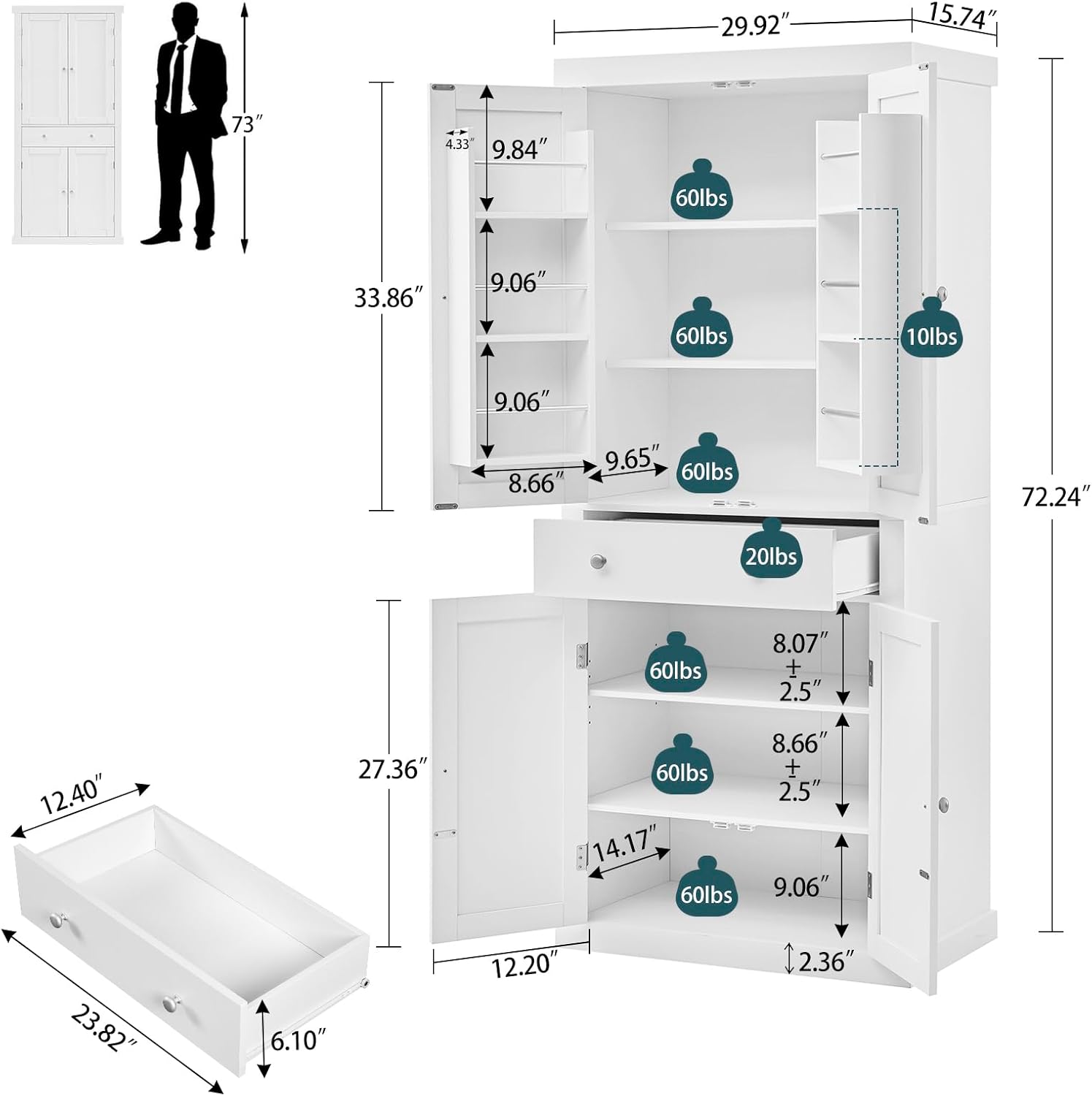 - 【Pantry Cabinet Information】Total Size: 29.92 "W x 15.74 "D x 72.24"H; Weights: 121 LB