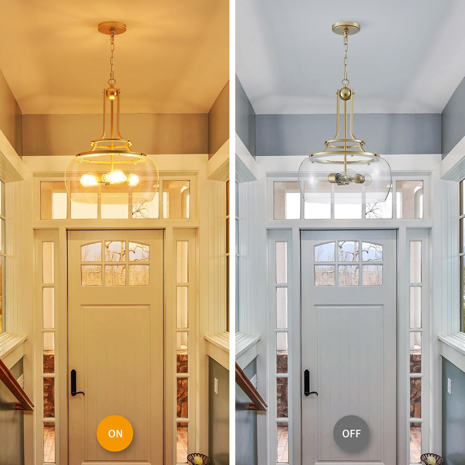 - Design: This rustic farmhouse Wuzups pendant chandelier light with design offers a modern interpretation of a classic urban-industrial style, which adds a vintage flair to your space. It comes in a gold finish and features a prominent round clear seeded glass shade that has pinprick bubbles that add to the vintage look and feel.