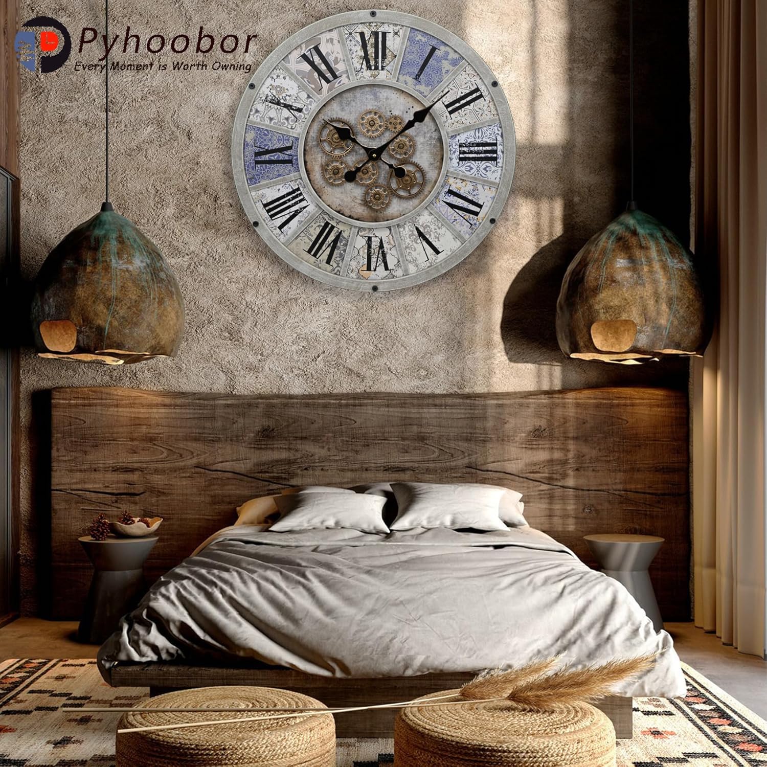 - UNIQUE DESIGN | This one-of-a-kind large round wall clock has a solid metal frame and real mechanical moving gears. Unlike other timepieces, this clock stands out with its vintage and industrial design. Its real moving gears add charm and function, giving it a unique and attractive look that exudes rustic and industrial vibes.