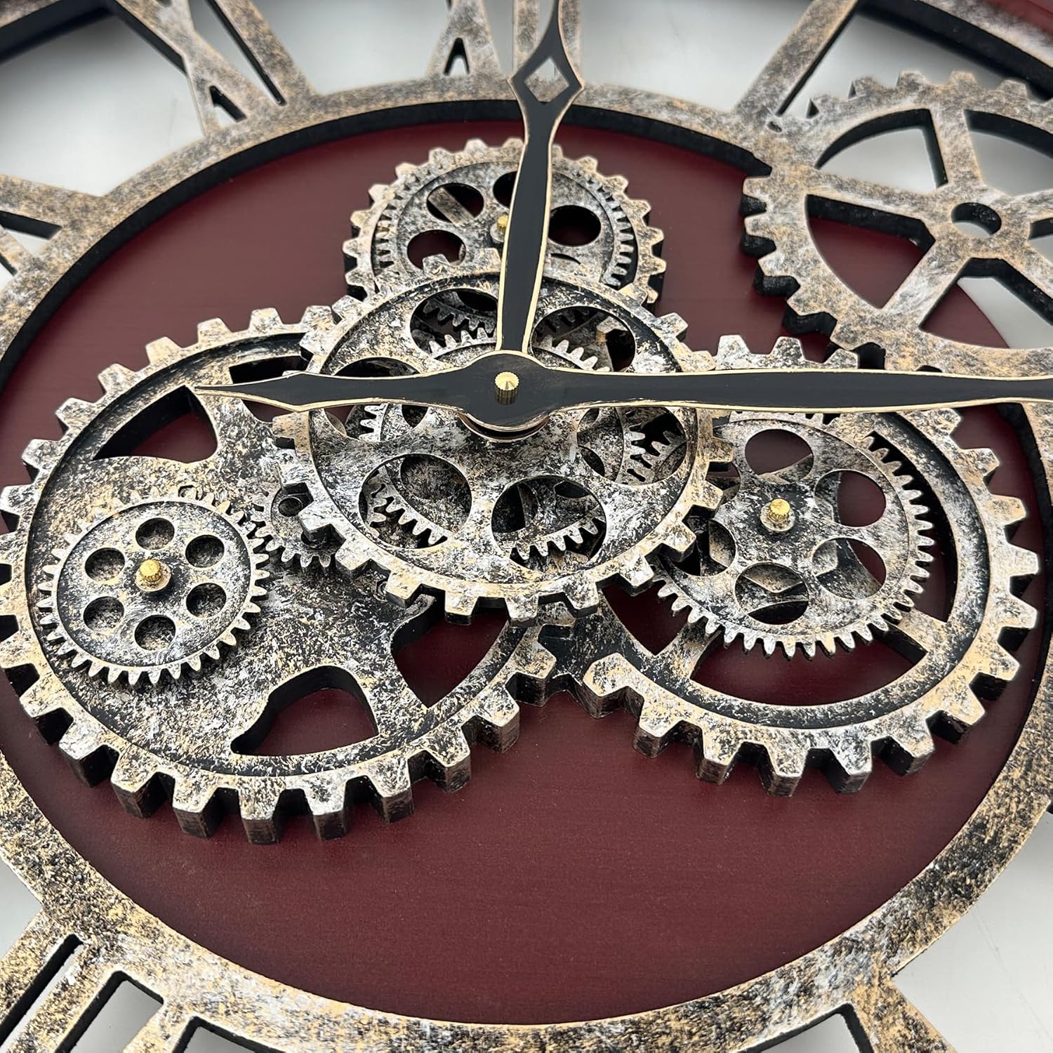 - REAL MOVING GEARS: Large wall clock with unique moving parts is as attractive as it is functional. Put batteries in, various gears start rotating fluently. Moving gear wall clock is amazing looking on the wall and will get so many compliments on it. Made from solid wood and painted by Rust-like color on wall clock create a very rustic and industrial atmosphere. Large farmhouse wall clock is professionally handmade and pursuit of naturalness, so it may have some little imperfections