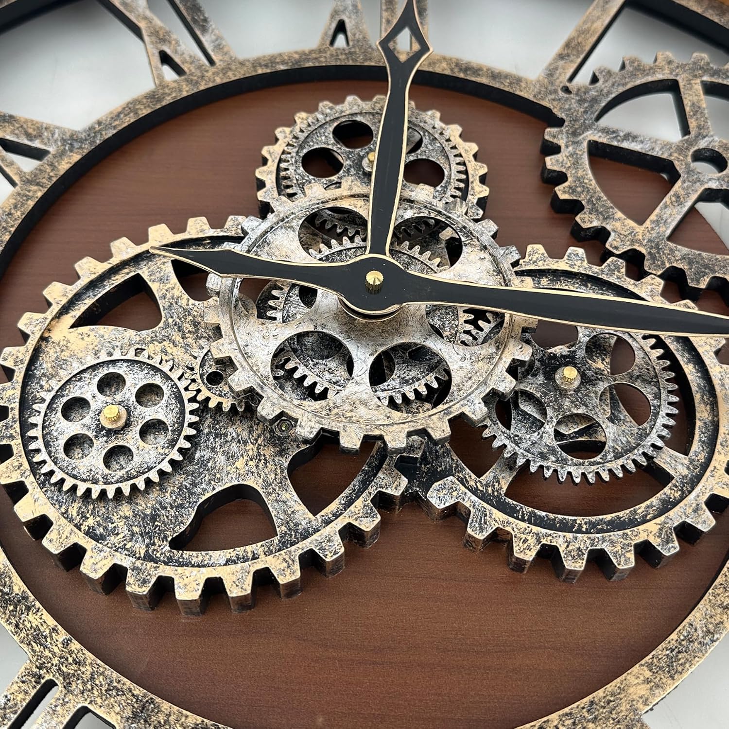 - REAL MOVING GEARS: Large wall clock with unique moving parts is as attractive as it is functional. Put batteries in, various gears start rotating fluently. Moving gear wall clock is amazing looking on the wall and will get so many compliments on it. Made from solid wood and painted by Rust-like color on wall clock create a very rustic and industrial atmosphere. Large farmhouse wall clock is professionally handmade and pursuit of naturalness, so it may have some little imperfections