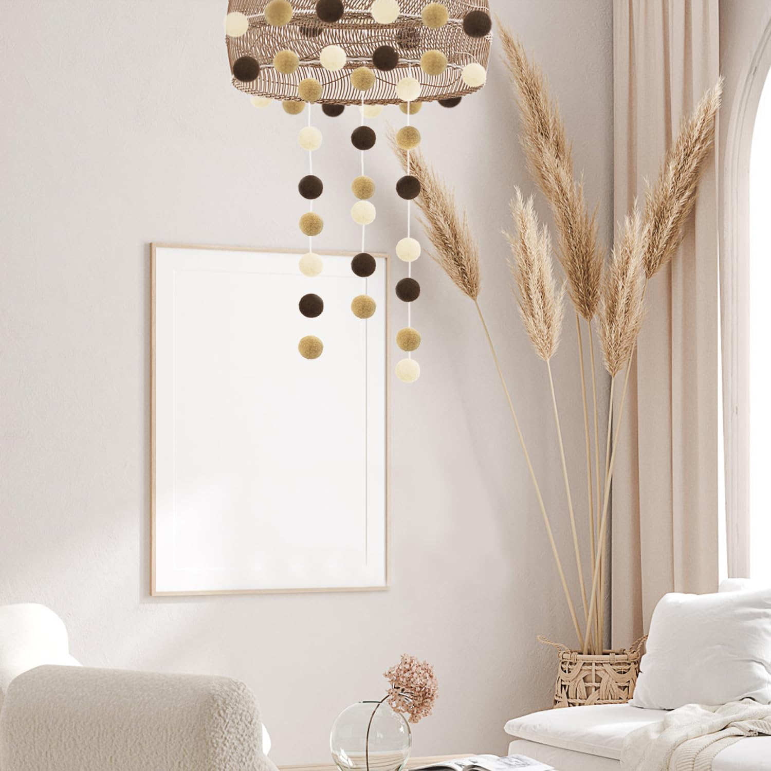 Jishi Pom Pom Garland Boho Party Decorations, 3-Pack Brown Khaki Beige Felt Ball Garland Cute Pastel Rainbow Pompom Strings, Christmas Birthday Wedding Rustic Boho Home Decor Supplies, Xmas Tree Decor
