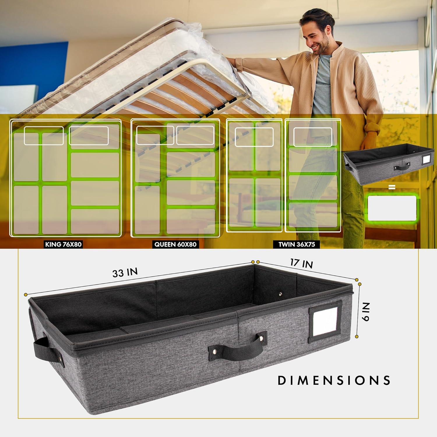 - ๐๐๐๐ ๐๐๐ญ๐ข๐จ๐ง๐ข๐ ๐๐ฅ๐จ๐ญ๐ก ๐๐๐ญ๐๐ซ๐ข๐๐ฅ: Made from premium quality fabric, our 33x17x6" Under Bed Storage Containers With Lids are durable, sturdy, & carefully designed to hold large quantities of clothes, blankets, shoes, & various bed accessories. These under bed storage dorm drawers are designed to fit perfectly under your bed for efficient bed room organization and storage, making it an under bed organizer that will easily blend into your home's aesthetic style.