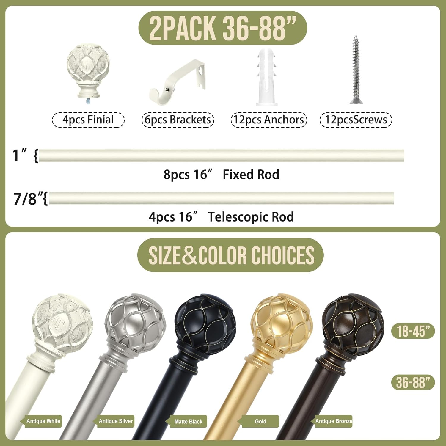 - 2 Pack Curtain Rods for Windows 48 to 84 inch(4-7ft): TANGWIN drapery rods include 8 x 16" x 1" fixed rods, 4 x 16" x 7/8" adjustable rods, 4 x finial, 6 x bracket, 6 x connector, 12 x anchor, 12 x screw. 2 Pack antique white curtain rods for windows can extend from 36 to 88 inches, choose the right size curtain rods according to the length of your window.