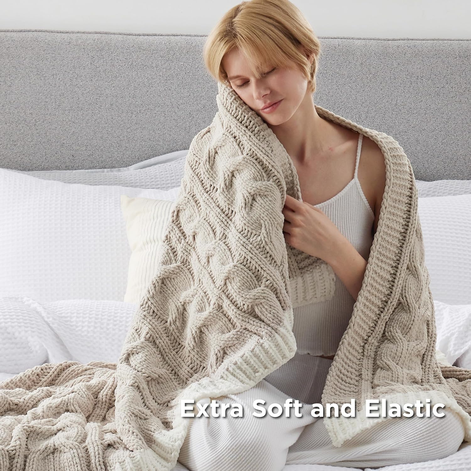 Bedsure Cable Knit Throw Blanket for Couch Bed - Breathable Chenille Chunky Knit Throw Blanket for Decorative Gift, GentleSoft Cozy and Warm for Winter and All Seasons, Beige, 50x60 Inches