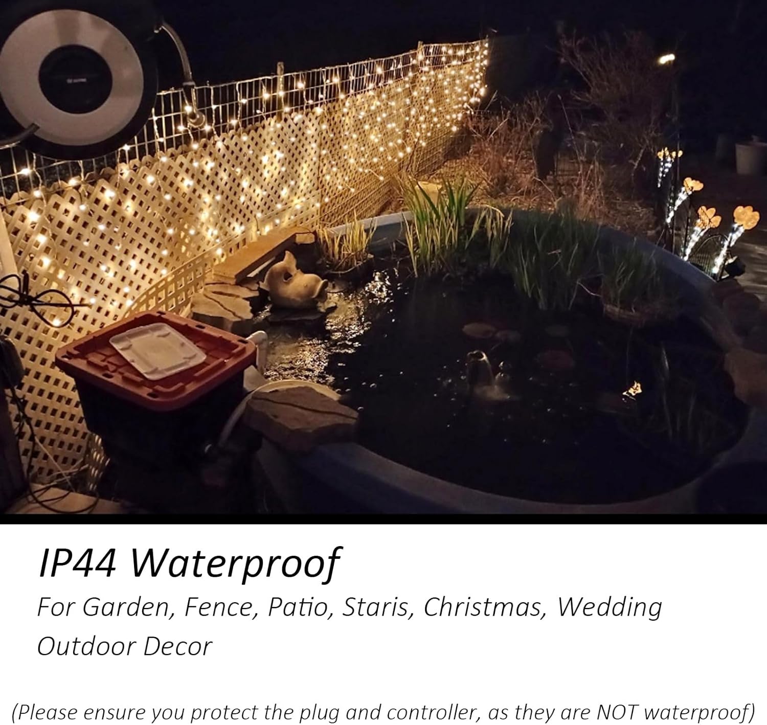- [40 ft (L) x 3.3 ft (H) Fence Curtain Lights] Boasting 600 LED lights, 2-3 times wider than others, making it ideal for outdoor decor. The product has an IP44 weatherproof rating, but please ensure you protect the plug and controller, as they are not waterproof. (please Note: they are NOT connectable)