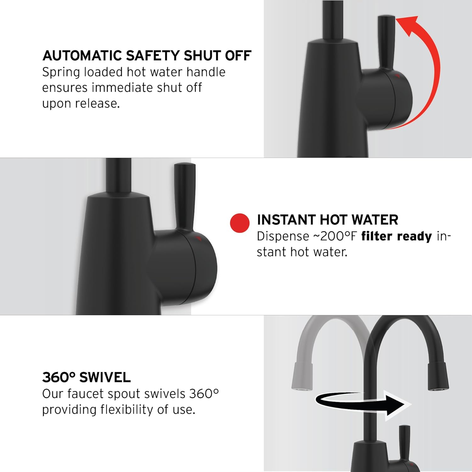 - HOT250 INSTANT HOT WATER DISPENSER: 8.21-inch faucet height, 2.97-inch width, single-handle faucet for kitchen sink in matte black and 750-watt, 2/3-gallon, stainless steel tank with adjustable temperature controls for near-boiling, instant hot water