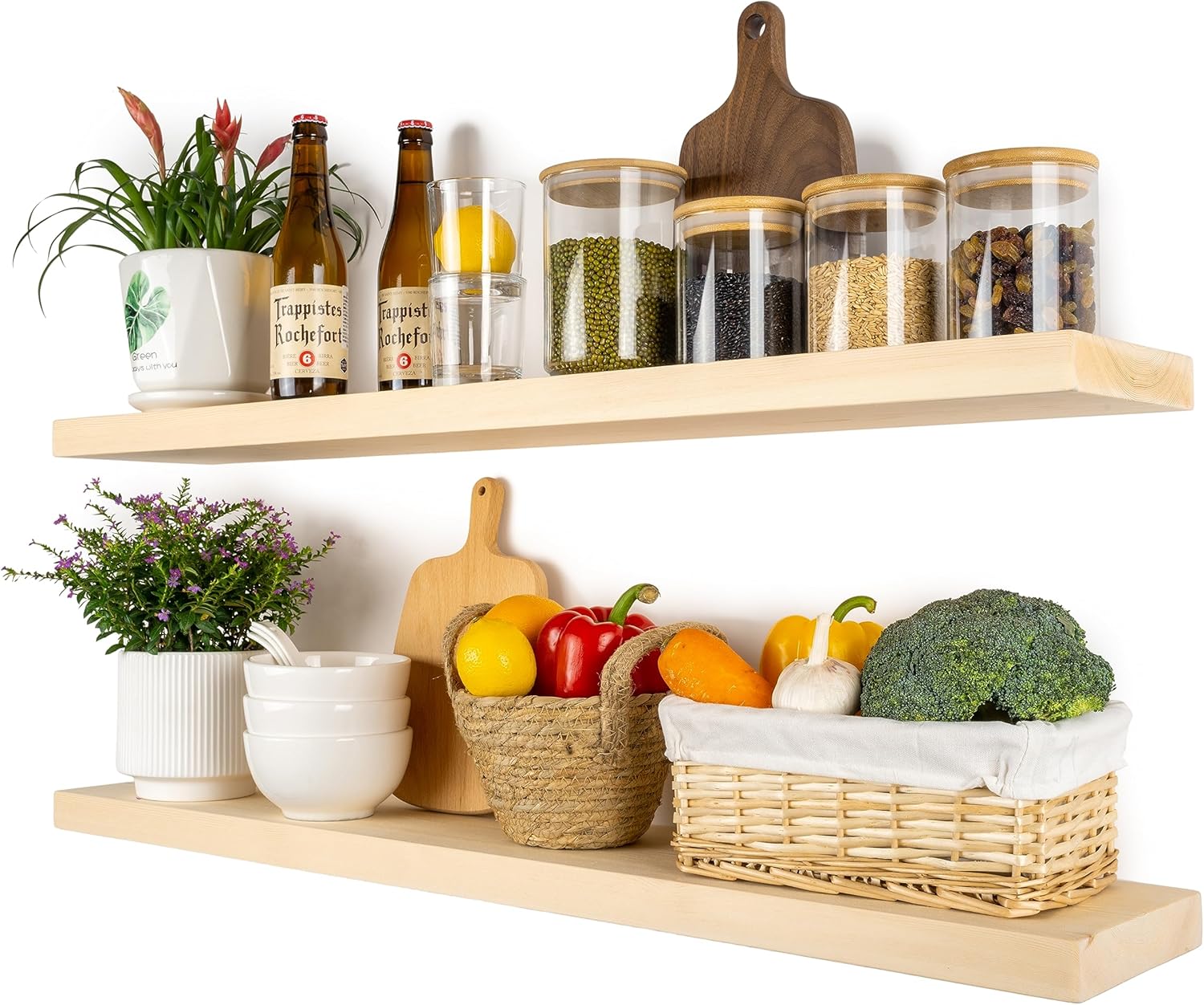 BGMG Wood Floating Shelves 36 inch, Wide Rustic Wooden Wall Shelves for Bathroom Living Room Bedroom Kitchen Farmhouse Set of 2-36x 6.7 x1.25 inch- DIY-Unfinished