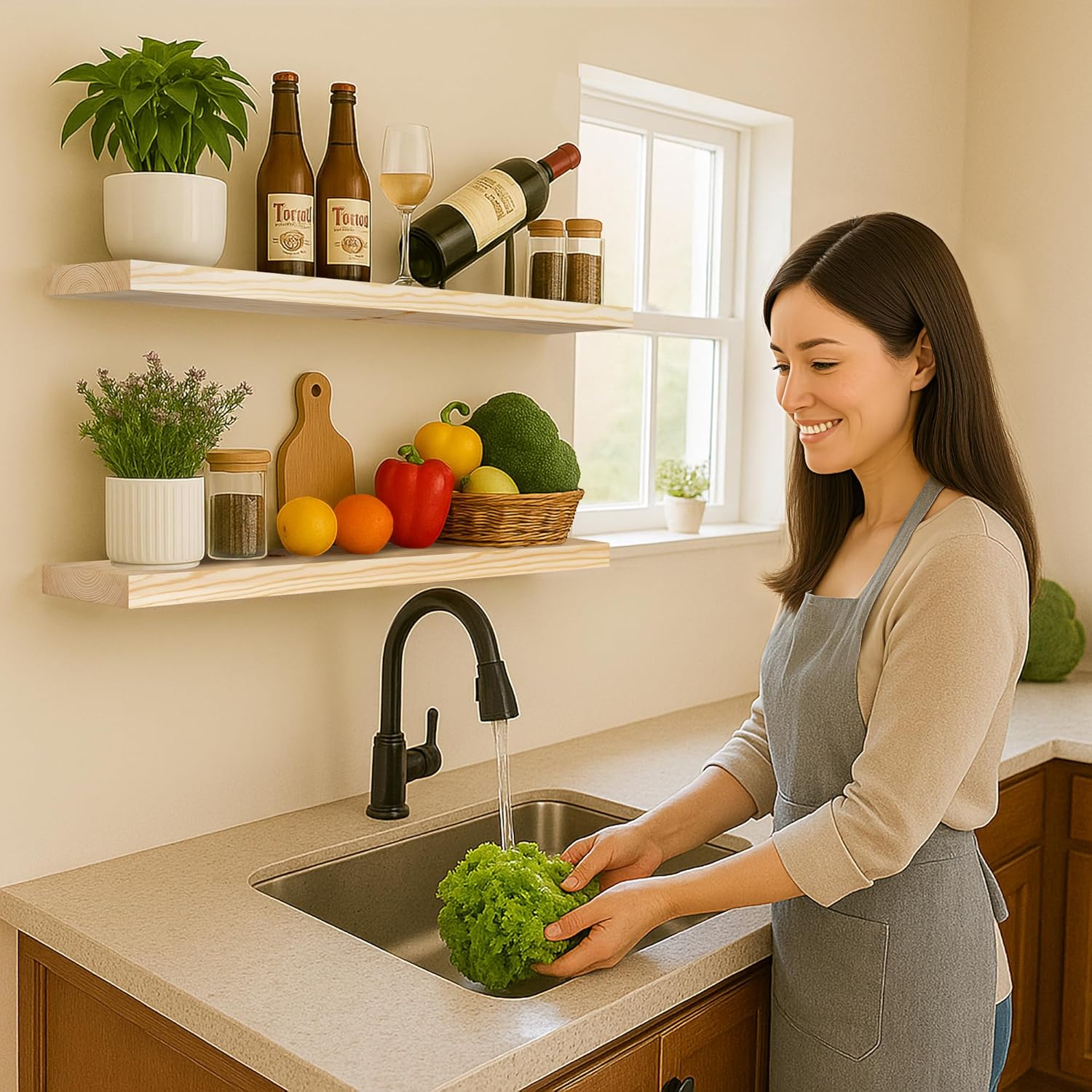 - MULTIFUNCTIONAL DECORATIVE SHELVES: Modern rustic style floating wall shelves are suitable for a variety of scenarios. Use it in the kitchen to store spices, bottles, cups; install it in the bathroom to store shampoo, conditioner, body wash and more. Also perfect for bedroom, living room, office, etc., beautiful and space-saving