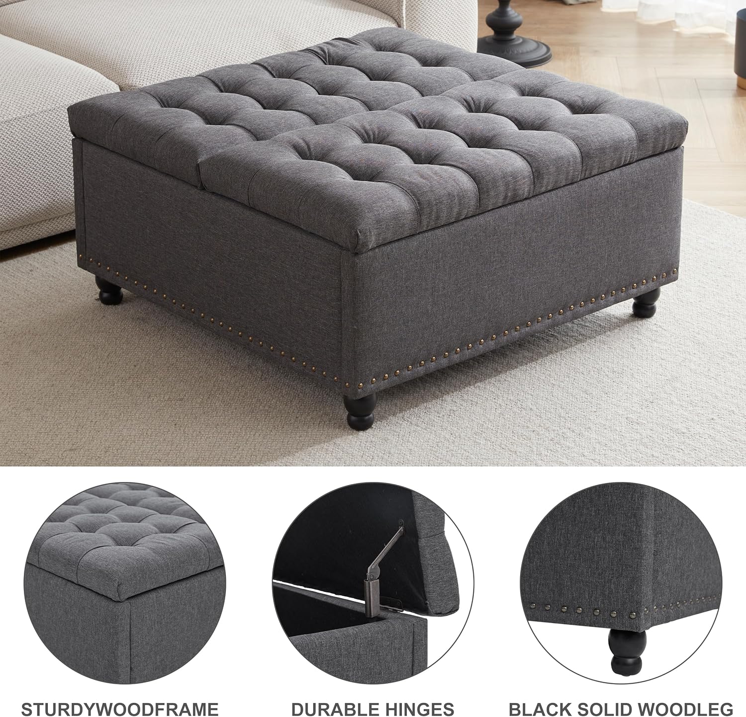 Tbfit Large Square Storage Ottoman Bench, Tufted Upholstered Coffee Table Ottoman with Lift Top & Wooden Legs, Oversized Storage Ottomans Toy Box for Living Room (Dark Grey)