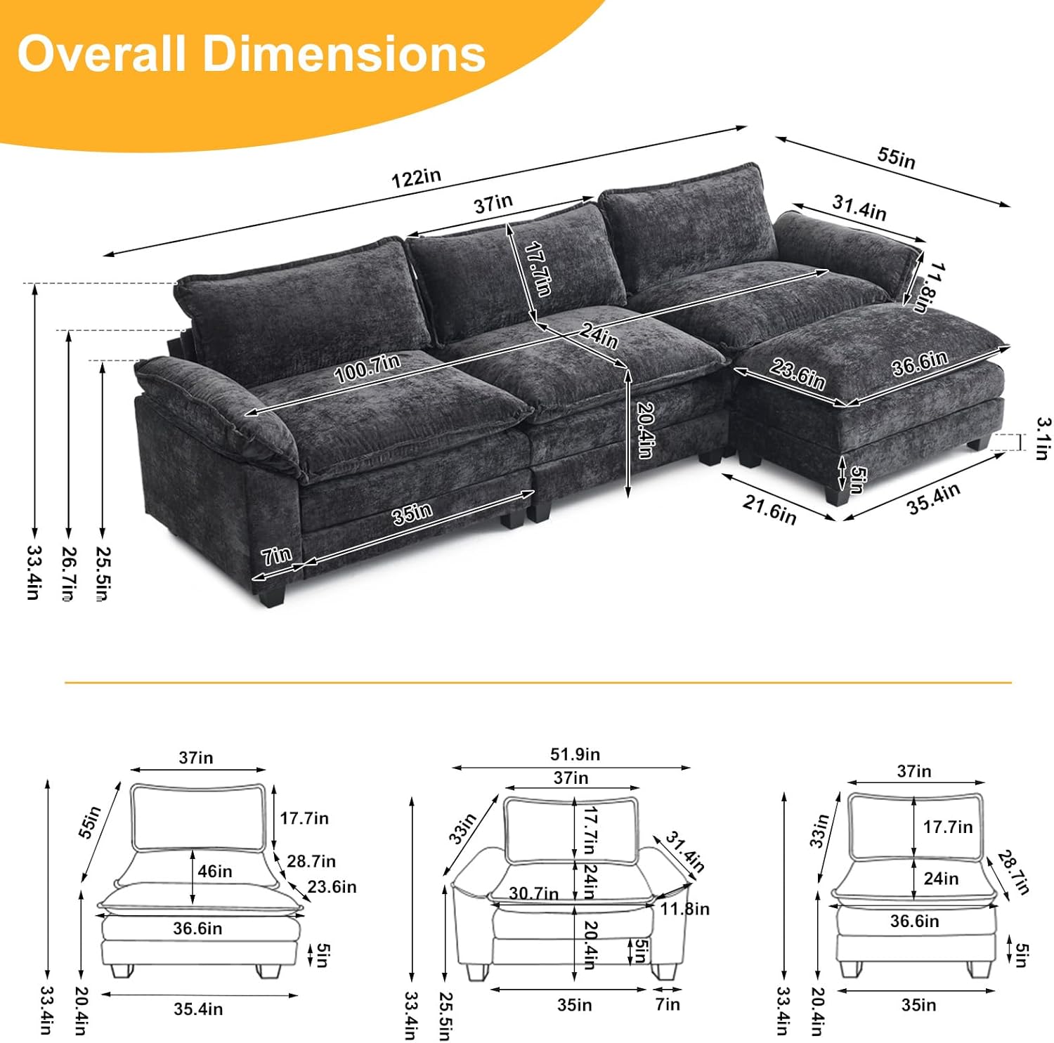 Karl home Sectional Sofa Modular Deep Seat Sofa Couch with Ottoman, Chenille Sofa Sleeper Comfy Upholstered Furniture for Living Room, Apartment, Studio, Office, (3-Seat & 1-Ottoman, Black)