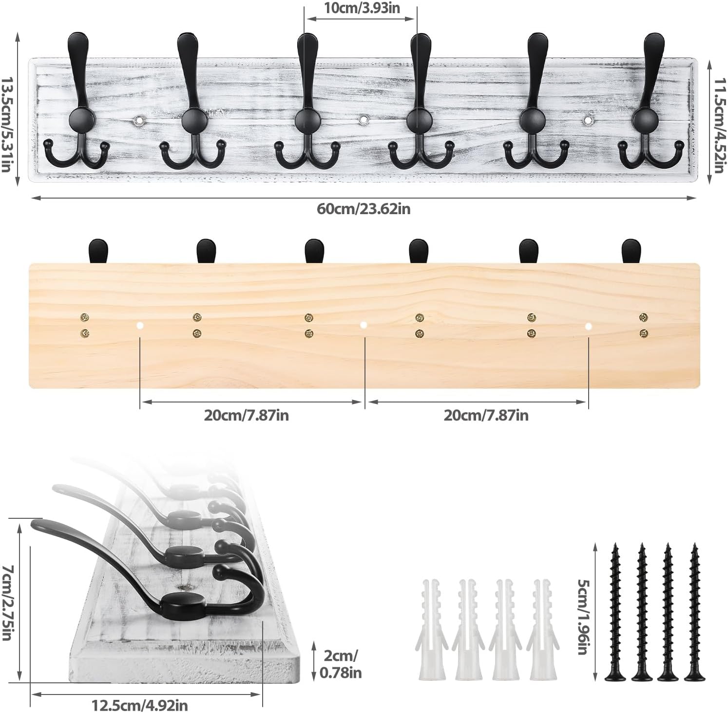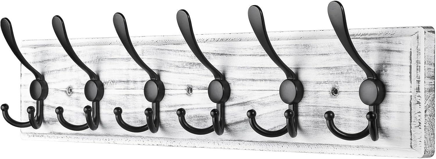 Coat Rack Wall Mount, Wooden Heavy Duty Coat Rack for Wall,6 Triple Coat Hanger Hooks for Hanging Coats,Jacket,Hat,Clothes (Grey White, 6 Hooks)