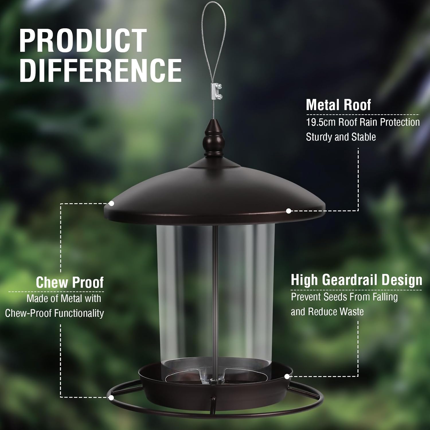 Metal Bird Feeder for Outdoors Hanging,3.0LB Seed Feeder,Easy to Fill & Clean,360° Feeding,Weatherproof Roof for Gardens and Wild Birds,Brown
