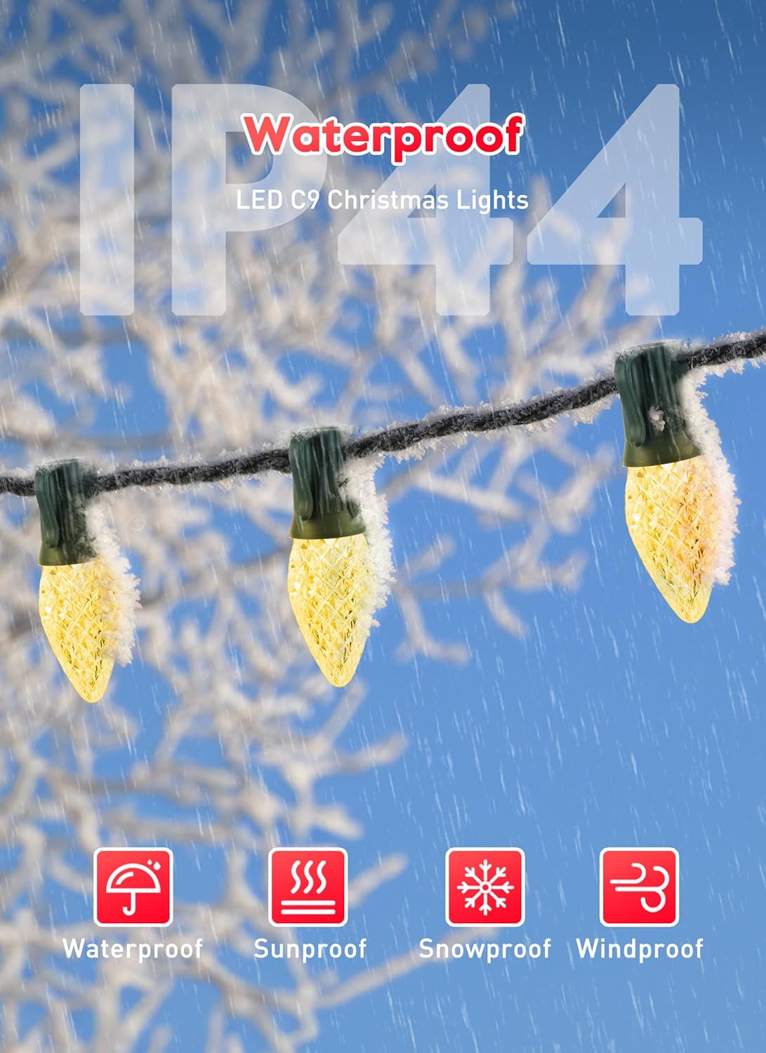 - Super Bright Vivid Lighting and Rectified: These commercial C9 string lights come with 100 led strawberry shatterproof c9 bulbs. Each c9 bulb with built-in high brightness SMD LED light bar and highly water sealing husk.the rectifier equipped inside the bulb base for preventing strobe lighting and Bring you better lighting effects, adding holiday cheer and warm atmosphere