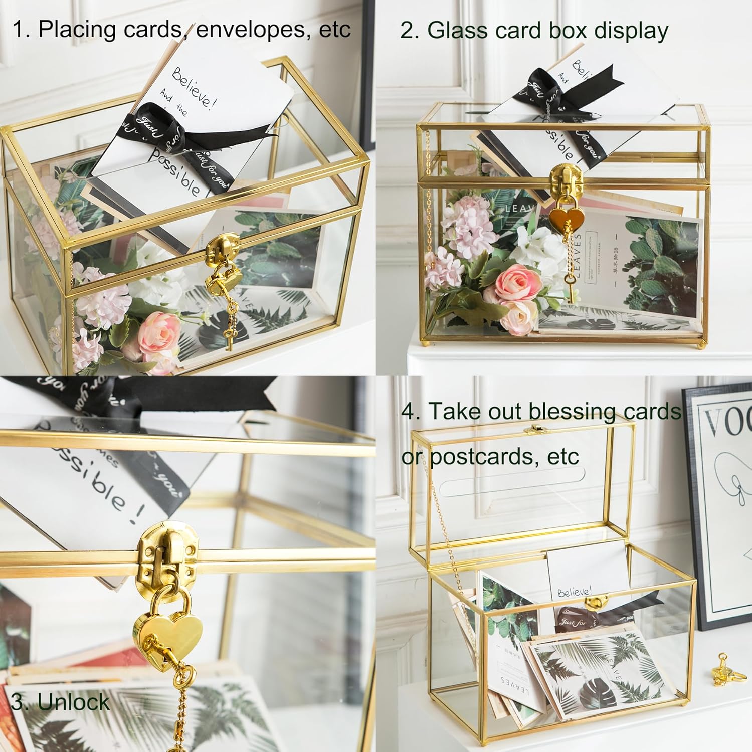 - Keep your cards and other valuables safe and secure with our clear lock box with 2 keys. Perfect for use as a display at any ceremony, this glass terrarium is made of reinforced glass and gold brass, ensuring its durability and safety. With thick poly dragon packing, we guarantee your delivery will arrive safely, ready to be used as a card holder or other decor item.