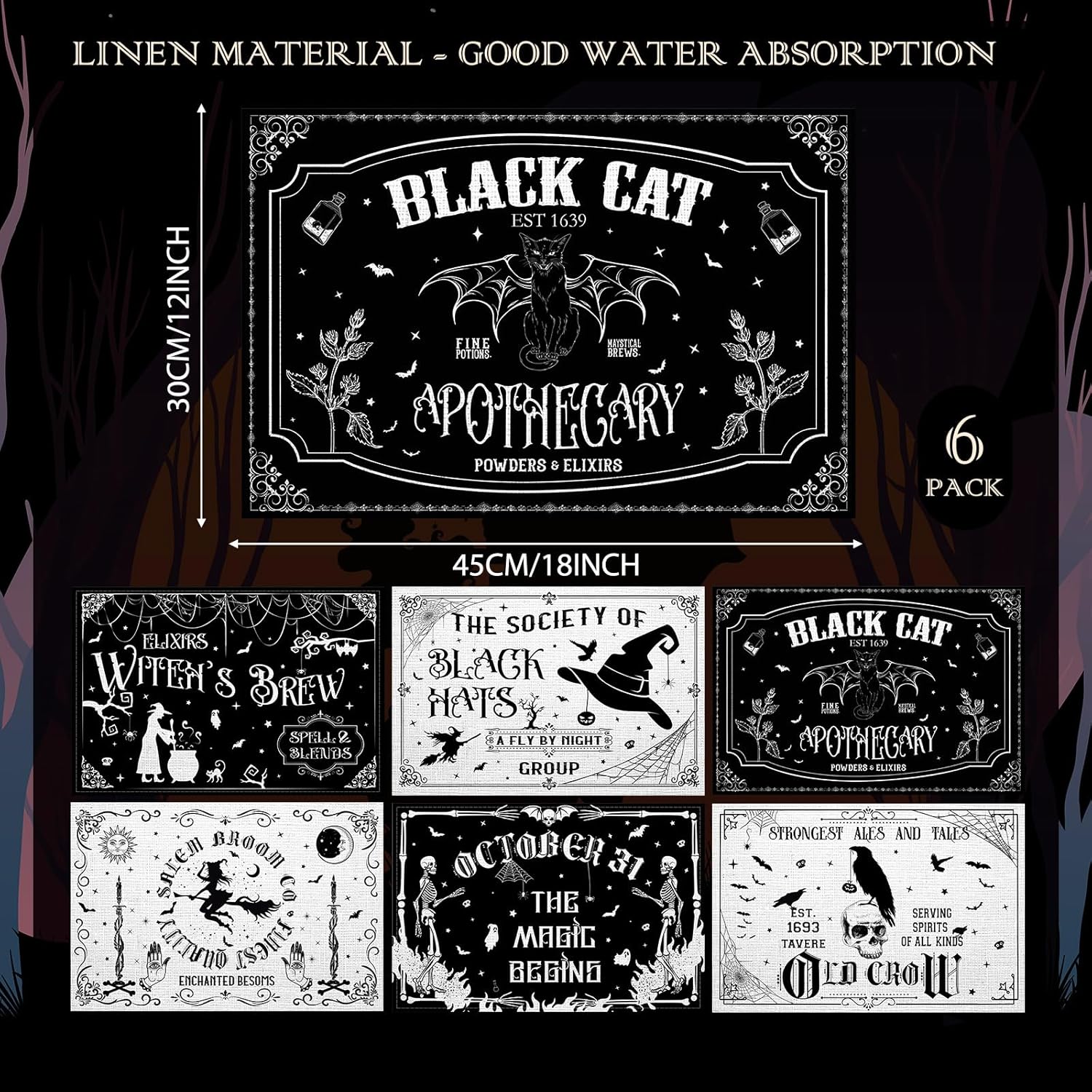 Umigy 6 Pcs Halloween Placemats 12"x18" Gothic Bat Placemats Kitchen Decoration Washable Witch Place Mats Rectangle Skull Table Mats for Halloween Dining Table Accessories(Black White Character Style)