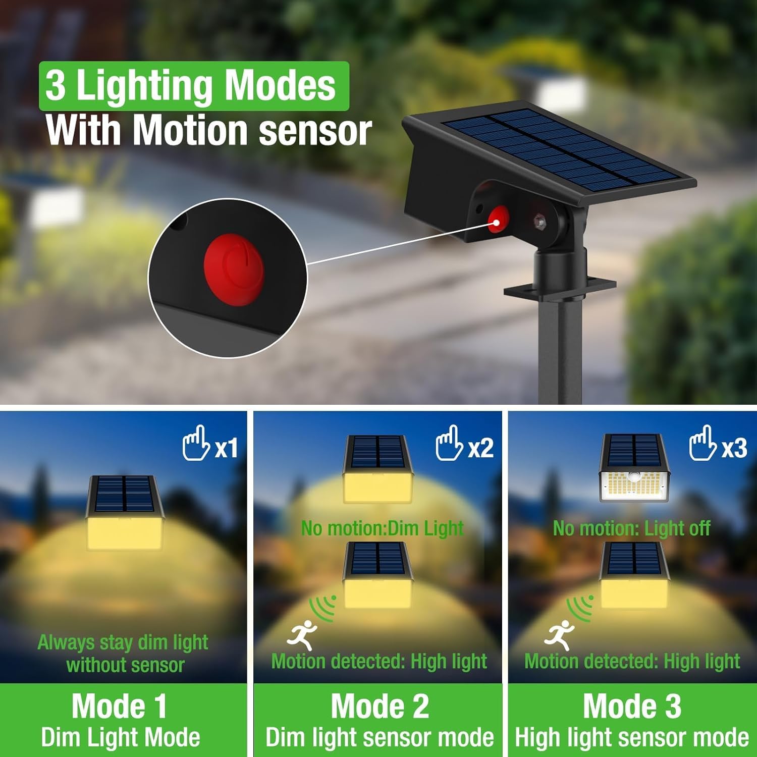 - Upgraded 3 Modes: Solar spot lights outdoor motion sensor have 3 option lighting modes, By changing modes, solar lights can continue to lighting for 9-72+ hours. 1. Constant dim light without motion sensor. 2.Dim light sensor mode 3.Security motion sensor mode.