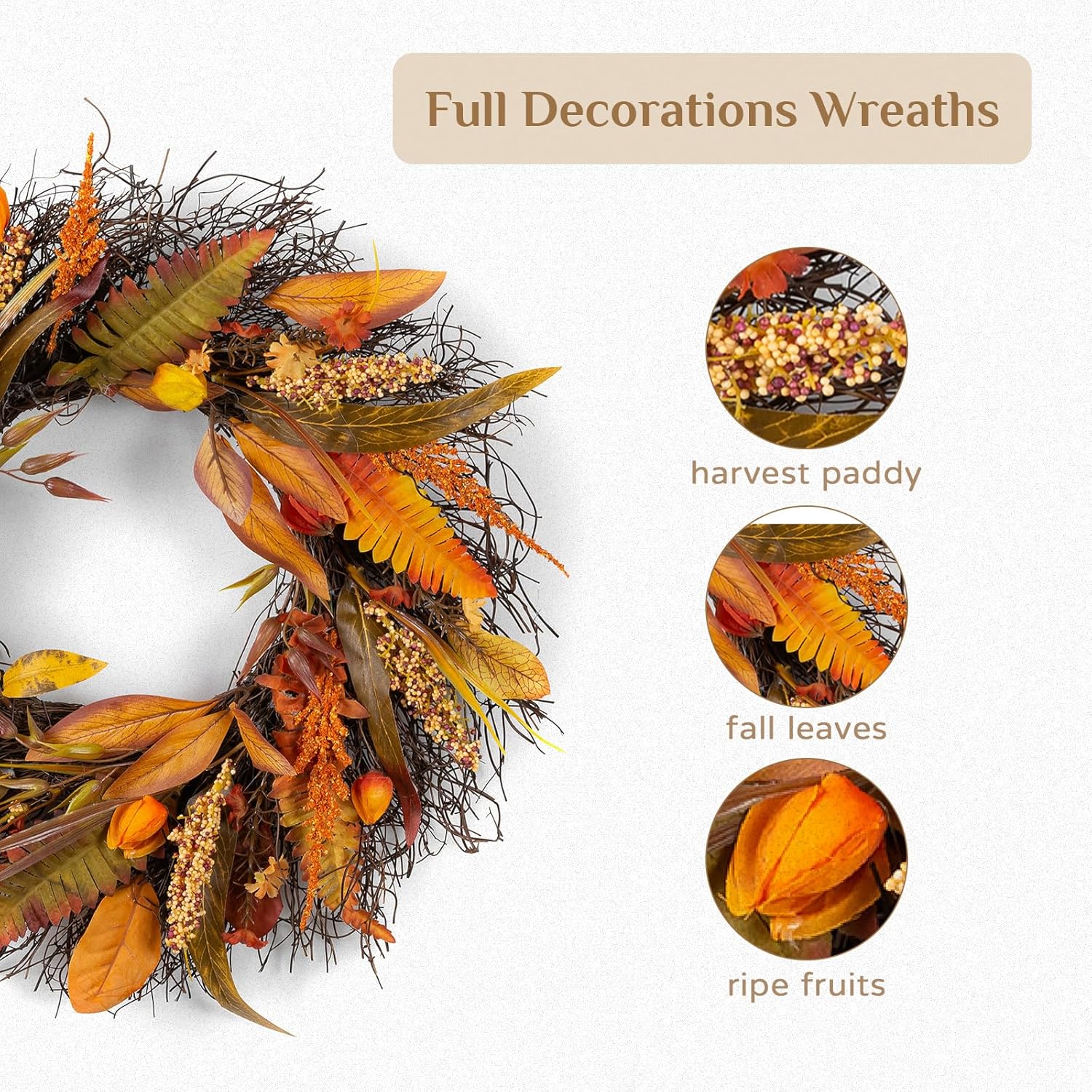 - Authentic Fall Charm: Embrace the essence of fall with our oversized wreaths, a lush tapestry of maple leaves and wheat grains artfully arranged on a sturdy grapevine twig. This door wreath isn't just a decoration; it's a statement that brings the warmth and comfort of autumn right to your doorstep.