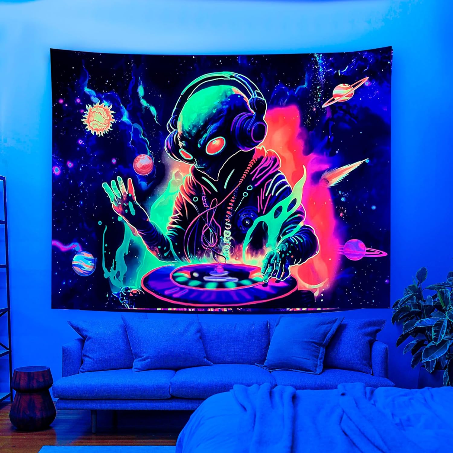 - Blacklight/UV Reactive: With special ink and advanced sublimation printing tech, our alien DJing wall tapestry can glow gorgeously under blacklight or UV light in the dark. The alien tapestry looks amazing and fabulous under black light, UV light, LED light or Neon. Besides, the pattern is also clear and gorgeous even under normal lighting due to our HD print tech.