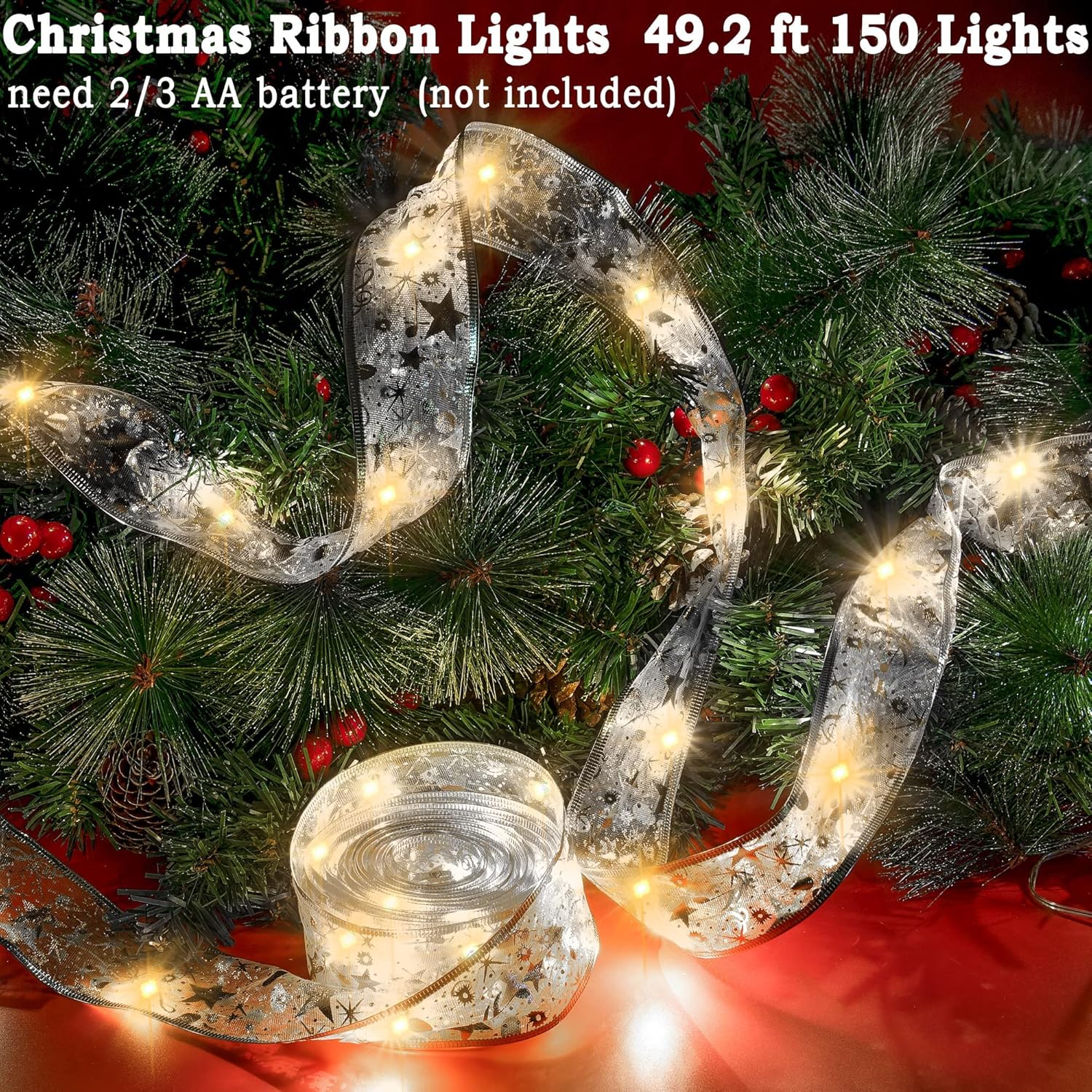 - 【 LED Christmas Ribbon String Lights 】- Powered by 3 × AA batteries, these ribbon string lights specially designed for Christmas trees are 33 feet long with 100 bright LEDs. The beautiful ribbon pattern and medium-sized LED bulbs add a cheerful and romantic touch to your Christmas Tree.