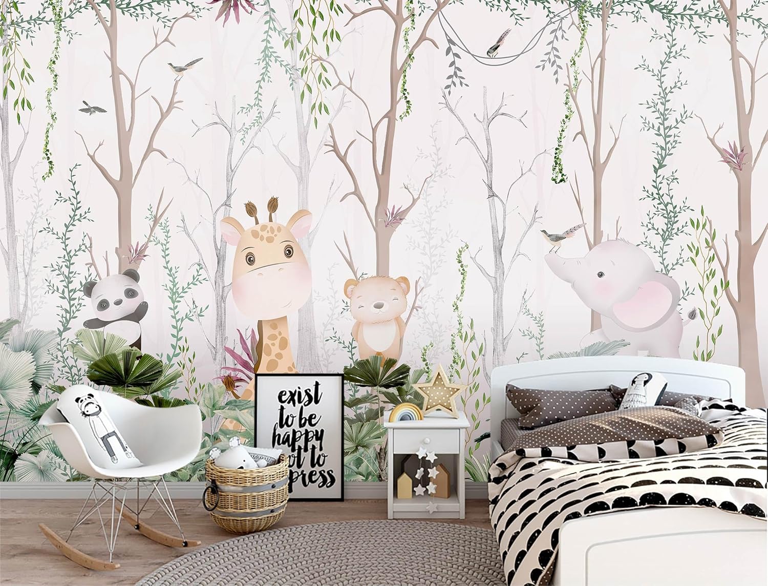 WFBHUA-Kids Tree Wallpaper Cute Animals Plants Bird Wall Decor Mural for Nursery Boys Girls Bedroom Room (Not Peel and Stick)