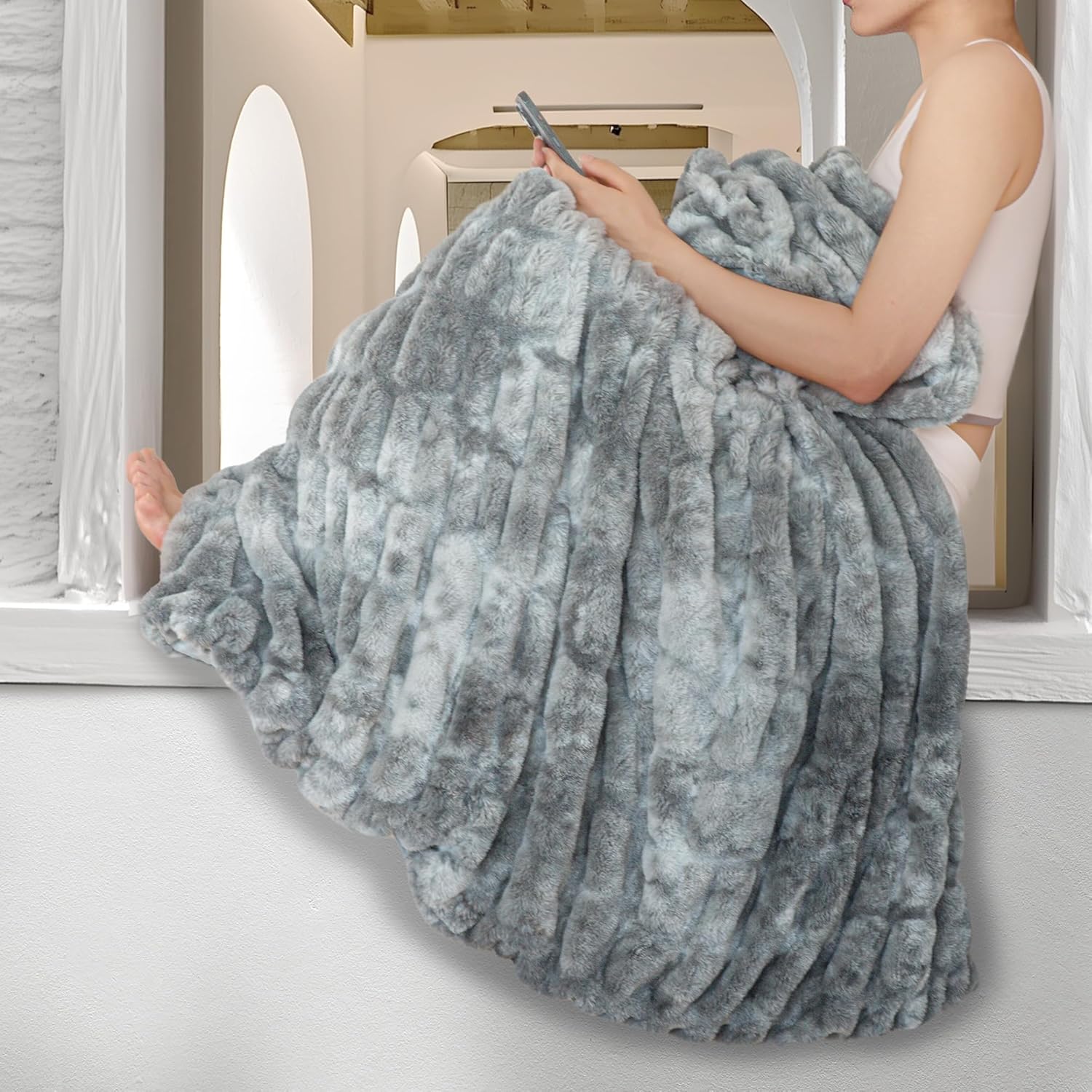 Faux Fur Blanket, Throw Blanket for Couch, Fluffy Blanket with Stretch Ruched Design, Ultra Soft Giftable Home Decor, 50x60 inches, Tie-Dyed in Gray