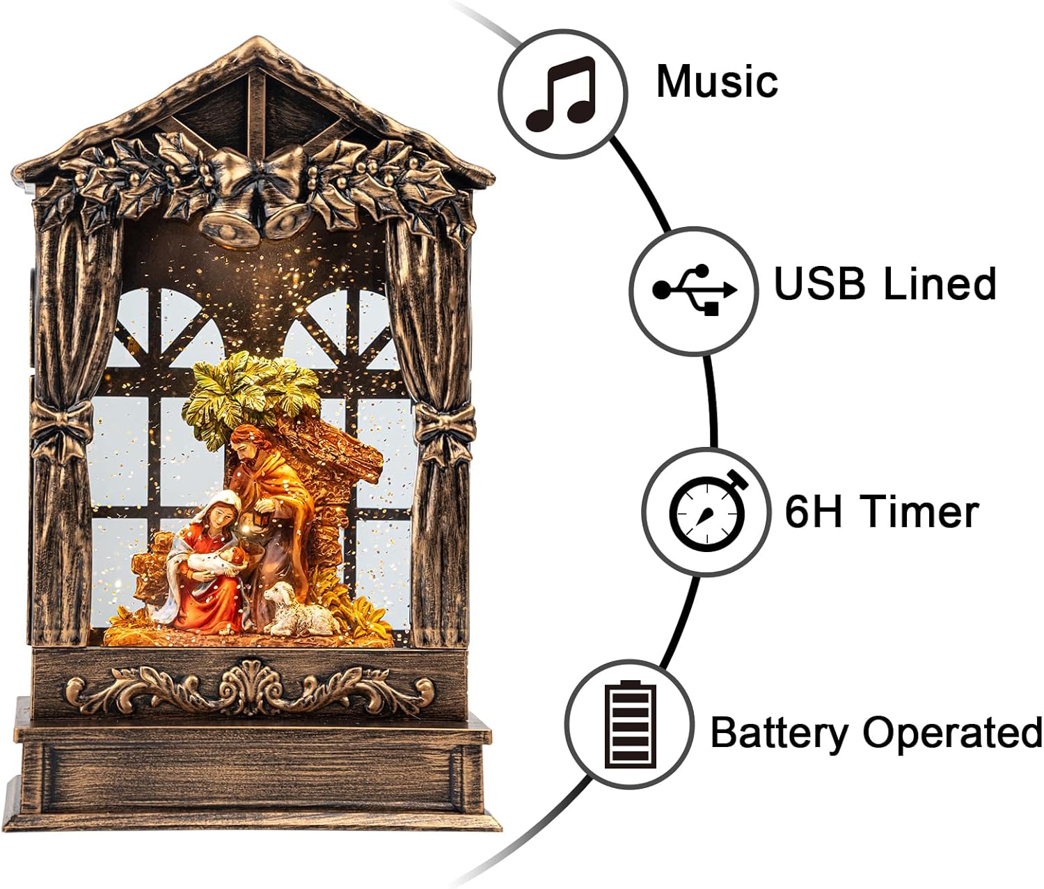- ⛪️【Nativity Figurines Manger】The Nativity Figurines Manger Scene design, When turned on a warm LED shines on the figurine and swirling glitter to gives our Christmas globe a whimsical look for the Christmas Holiday season.