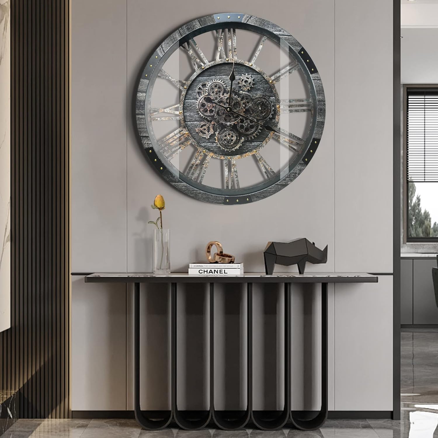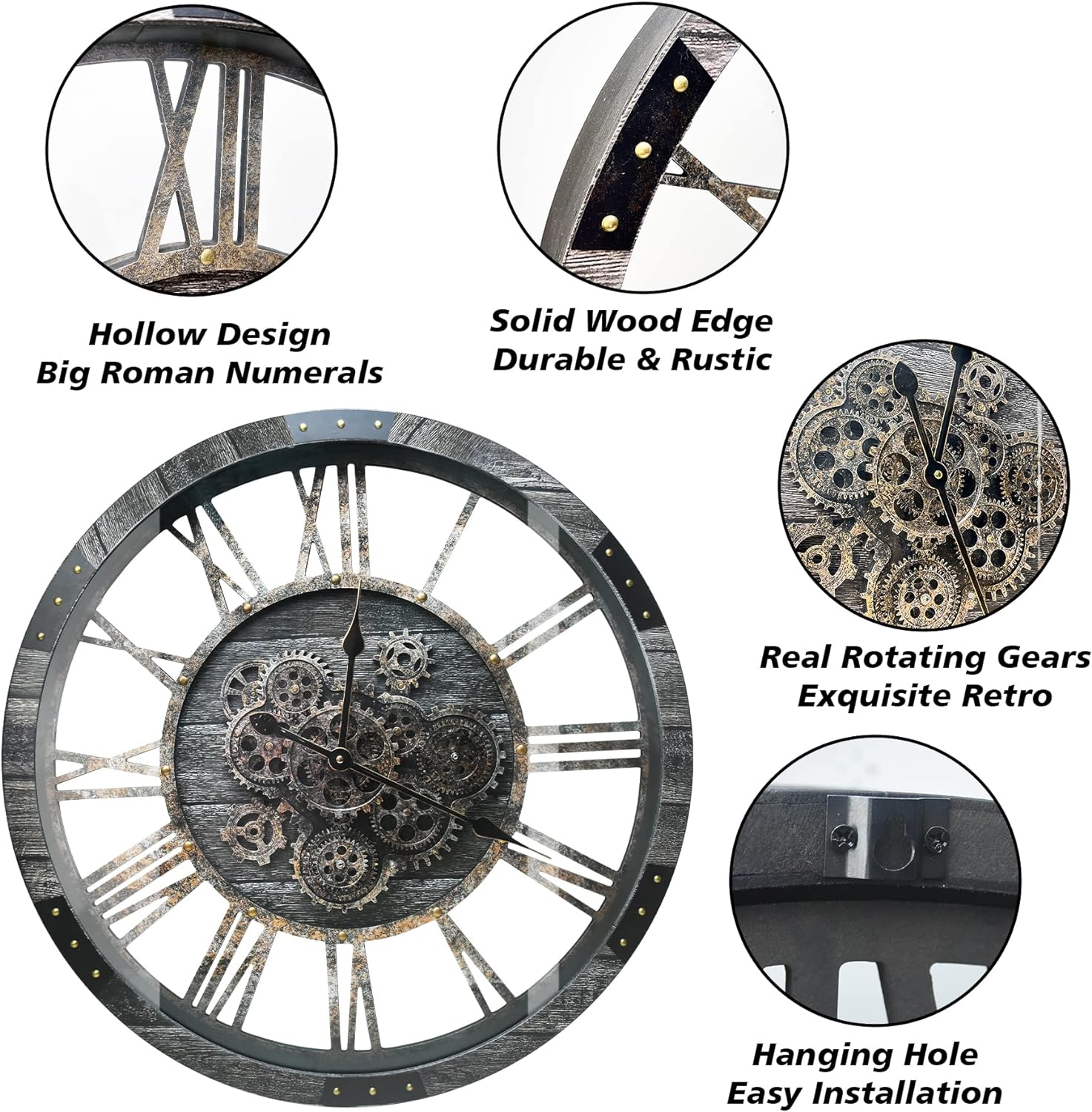 - ๐งญใUnique Design, Only For Your Homeใ Round solid Wood frame and classic retro skeleton with real mechanical moving gears in the central, the wooden frame is handcraft, showing unique attractive wood grain color and small natural knots; artificial rust-imitated treatment marks on the skeleton for vintage and industrial effect; stronger tempered glass resists any breakage and keeps safety whenever; The design is very different from other clocks, just to break the ordinary, only for your home.