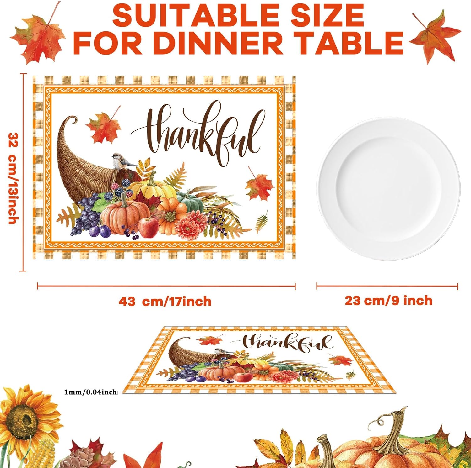 - 【Eye-Catching Design】Elevate your fall dining experience with our Thanksgiving placemats! The design of the Thanksgiving theme placemat incorporates classic elements of the turkey, maple leaf, pumpkin and harvest. Fall harvest placemats add a touch of brilliance to your table setting. Impress your guests and create an unforgettable cheerful atmosphere for your party.