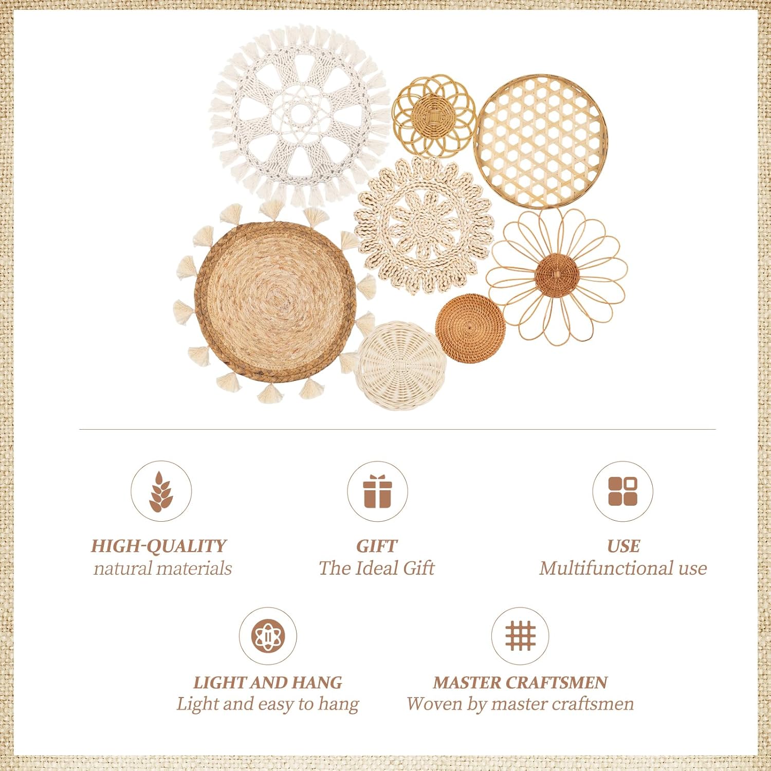 Boho Wall Basket Decor Set of 8 - Flat Woven Basket Wall Hanging Decor,Round Tassels White Macrame Tapestry Wall Decor Art,Handmade Rattan Wicker Seagrass Home Wall Baskets Decor(Boho Classic)