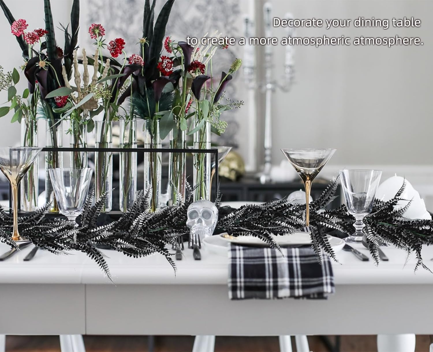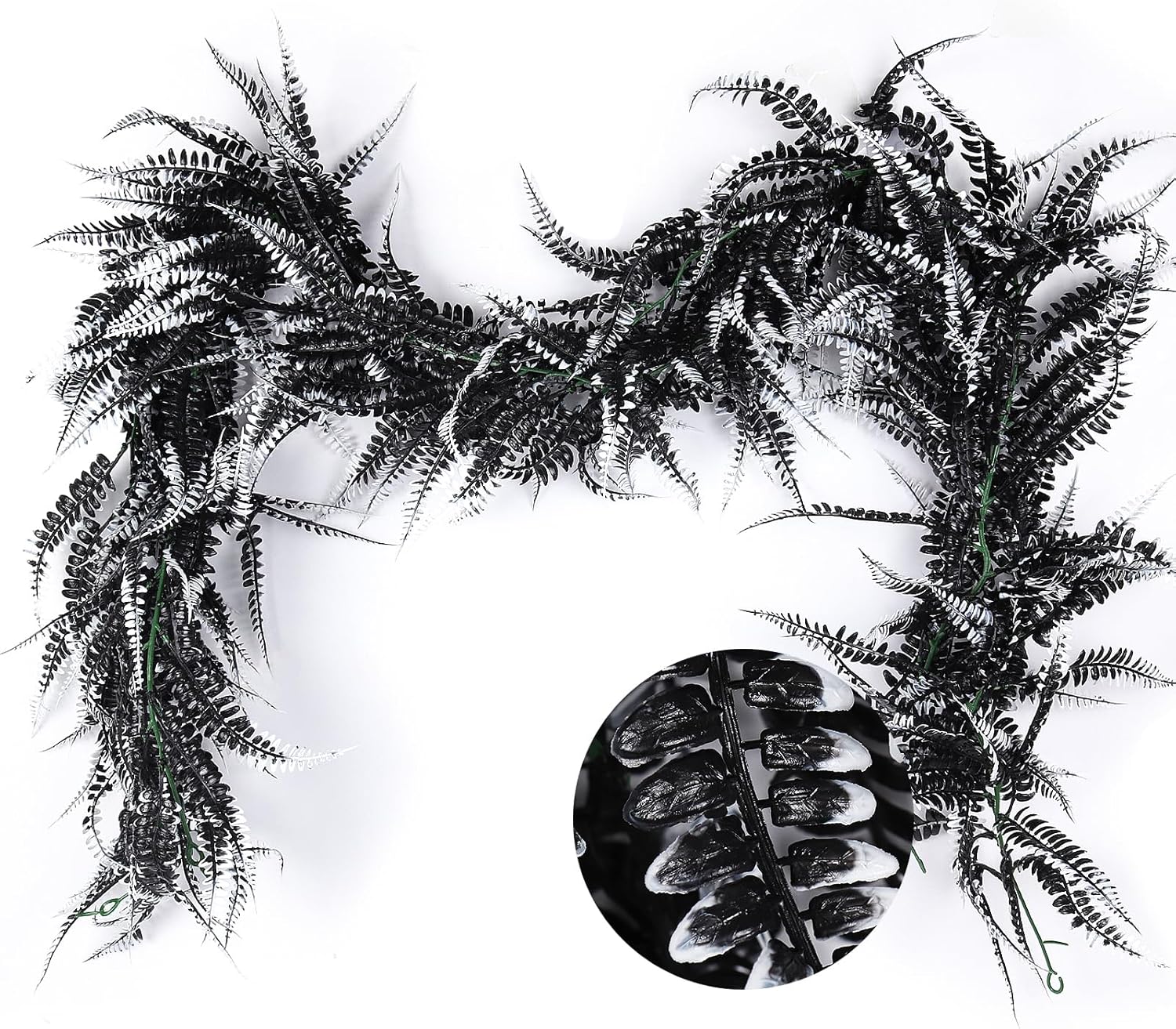 - 【Halloween Party Decoration】Black boston fern garland represent mystery, creating a mysterious atmosphere for your fall Halloween themed party. Black garland can also be used to decorate balconies, fireplaces, dining tables, door frames, door frames, stairs, railings, etc