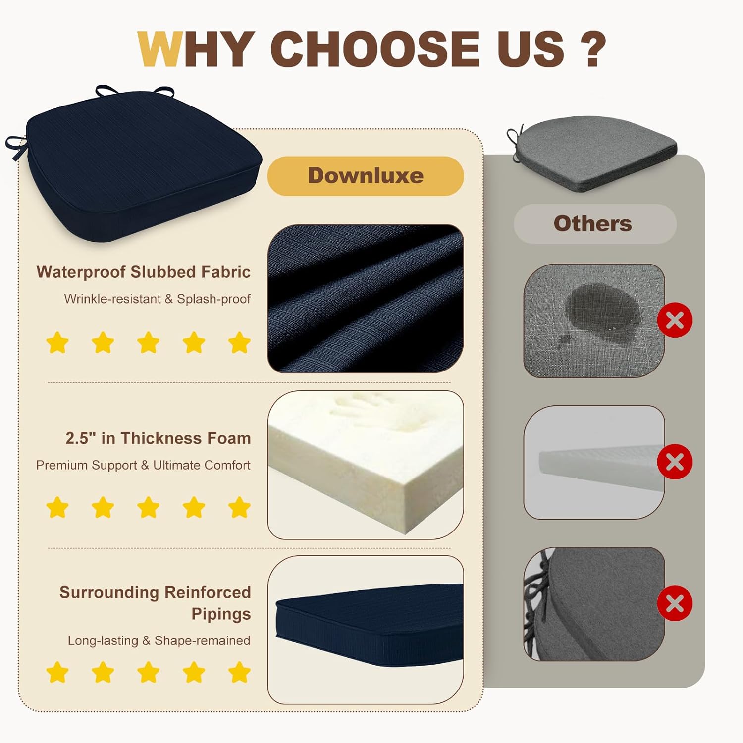 downluxe Chair Cushions for Dining Chairs, Waterproof Kitchen Chair Pads, Non-Slip Dining Seat Cushion with Ties, 17" x 16" x 2.5", Navy, 4 Pack