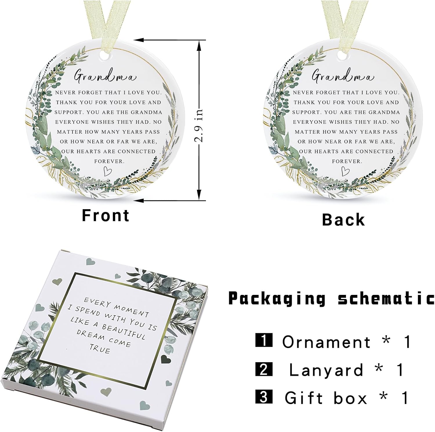 - ๐ผใPerfect and delicate sizeใThis is a grandma memory ornament with a diameter of 2.9 inches and a thickness of only 0.18 inches. The product includes: a round grandma ornamentt*1, a gift box*1 and a lanyard*1. The gift box comes with it makes it easy for you to give the best grandma ever gifts directly to family and friends and other special people in your life, and the lanyard that comes with it helps to hang it easily on the Christmas tree or anywhere you want.