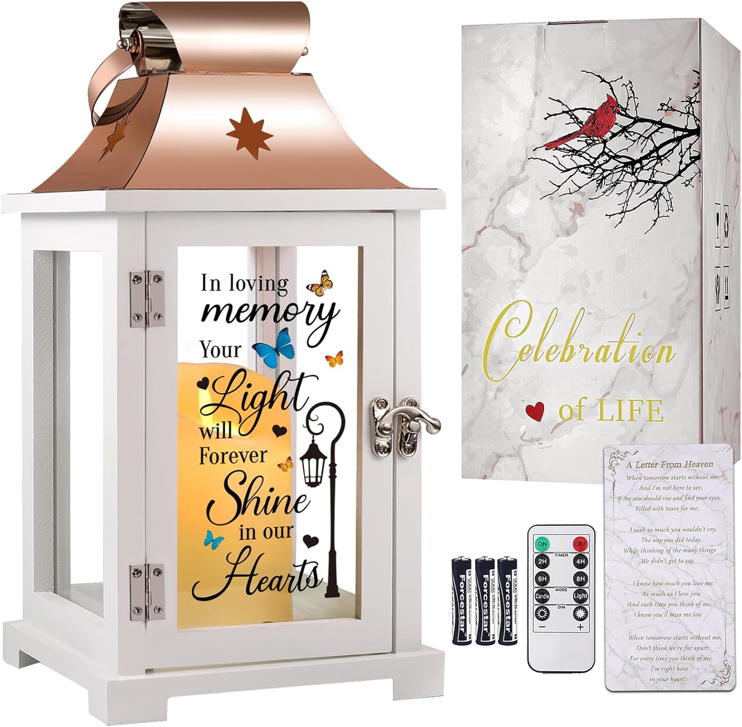- Sympathy Gift-Well Packaged to Gifts: The sympathy lantern comes with an original designed gift box with inspirational words "celebration of life" & "those we love don't go away"&"always near". It's also protected by tailor-made EPE foam to make sure nothing is broken.This is a valued memorial gift that will be cherished for years to come.