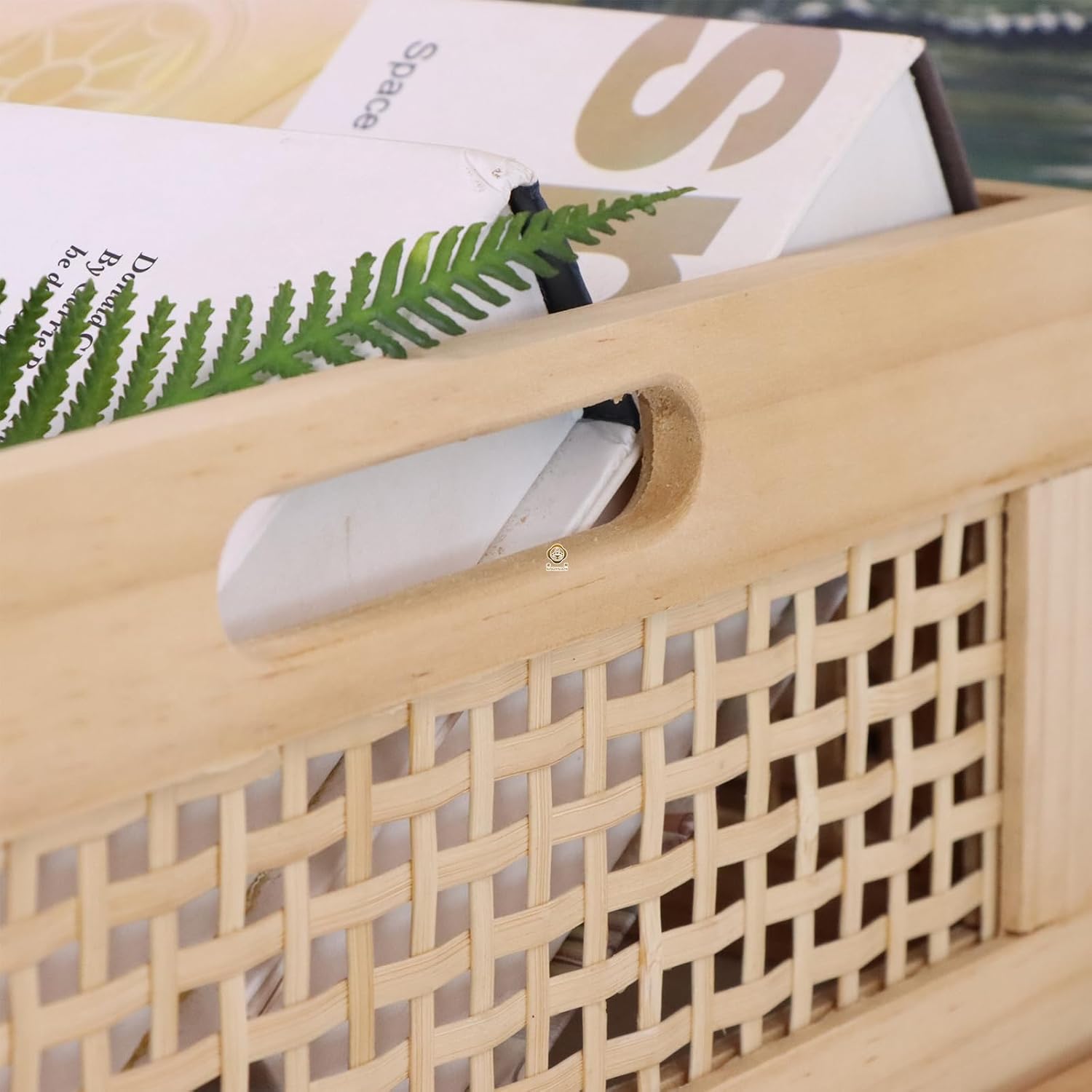 - [Natural Material] This wood storage basket made form high quality wood frame with bamboo net side decor. The sturdy construction ensures it can hold a variety of items, and it adapts to your needs, making it a versatile and stylish home accessory.