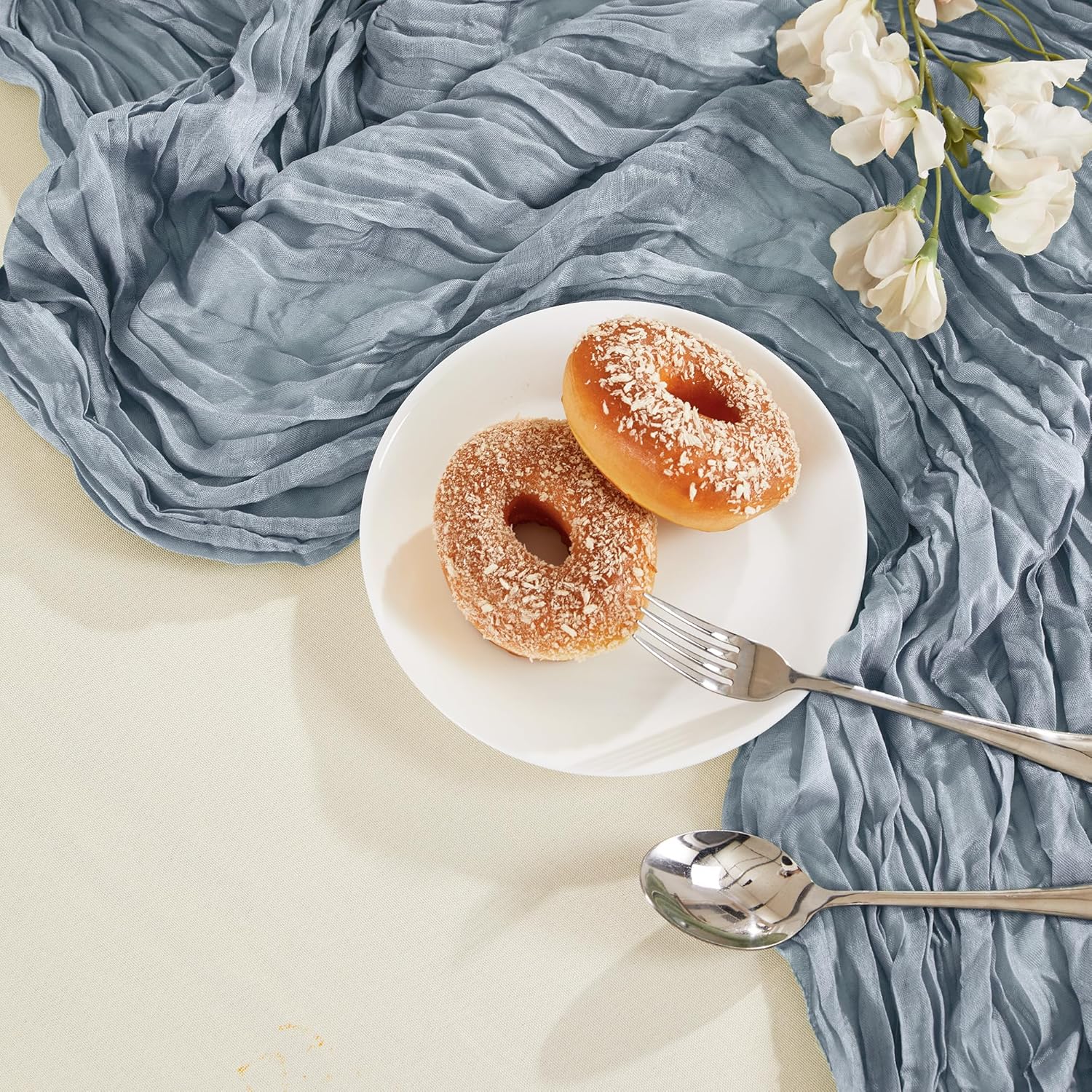 - PACKAGE INCLUDED: You will receive 12 pieces of dusty blue cheesecloth table runners. Elegant and beautiful design, exquisite workmanship. Product size: Each boho table runner is 35 x 120 inches. Enough to cover rectangles and round tables, as well as long tables that are stitched together. It can even be used to belt chairs decorate napkins, background curtains. Round or square tables for 8-10 people, perfect for romantic and elegant party events
