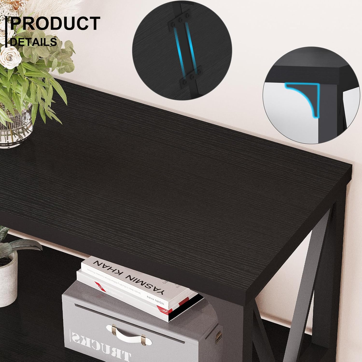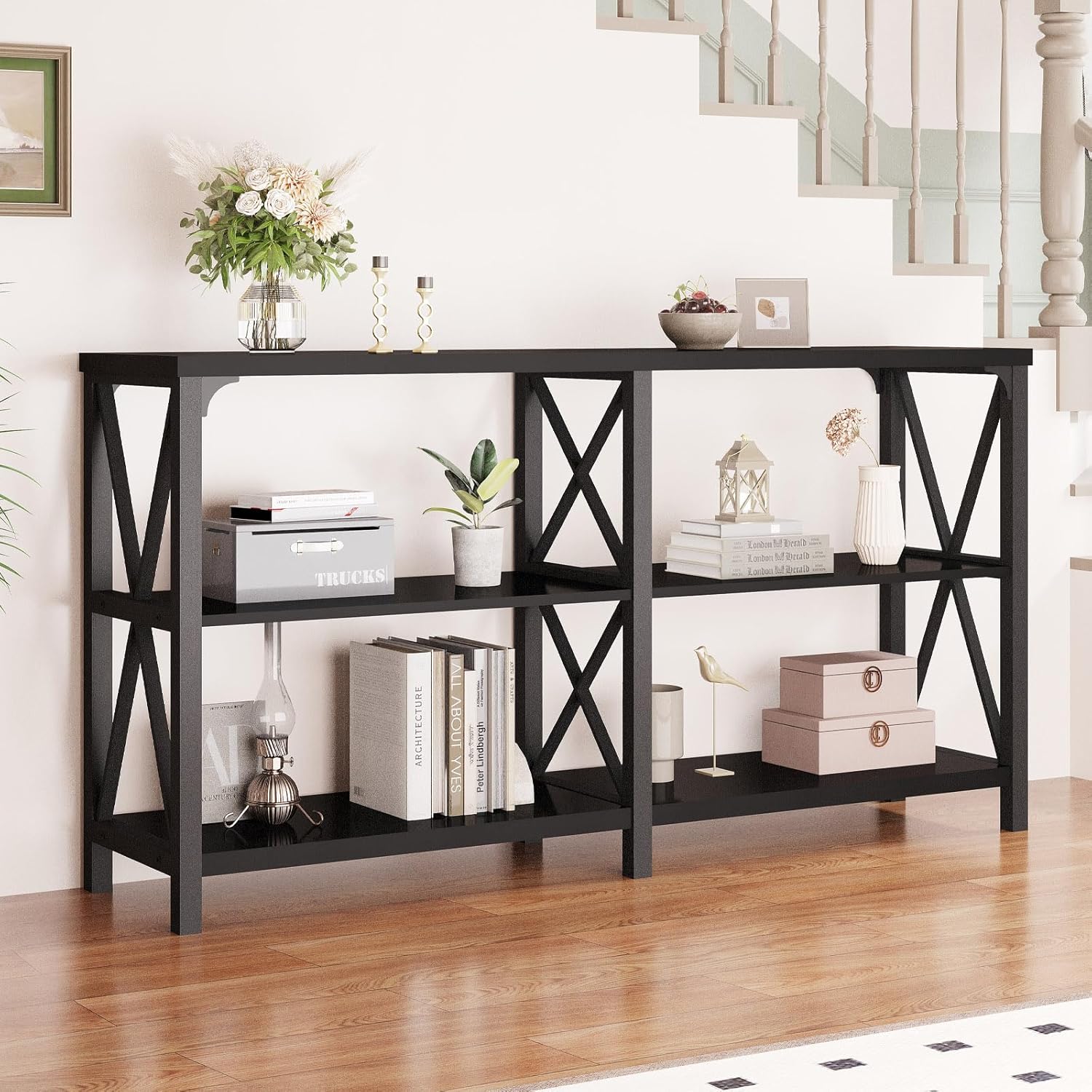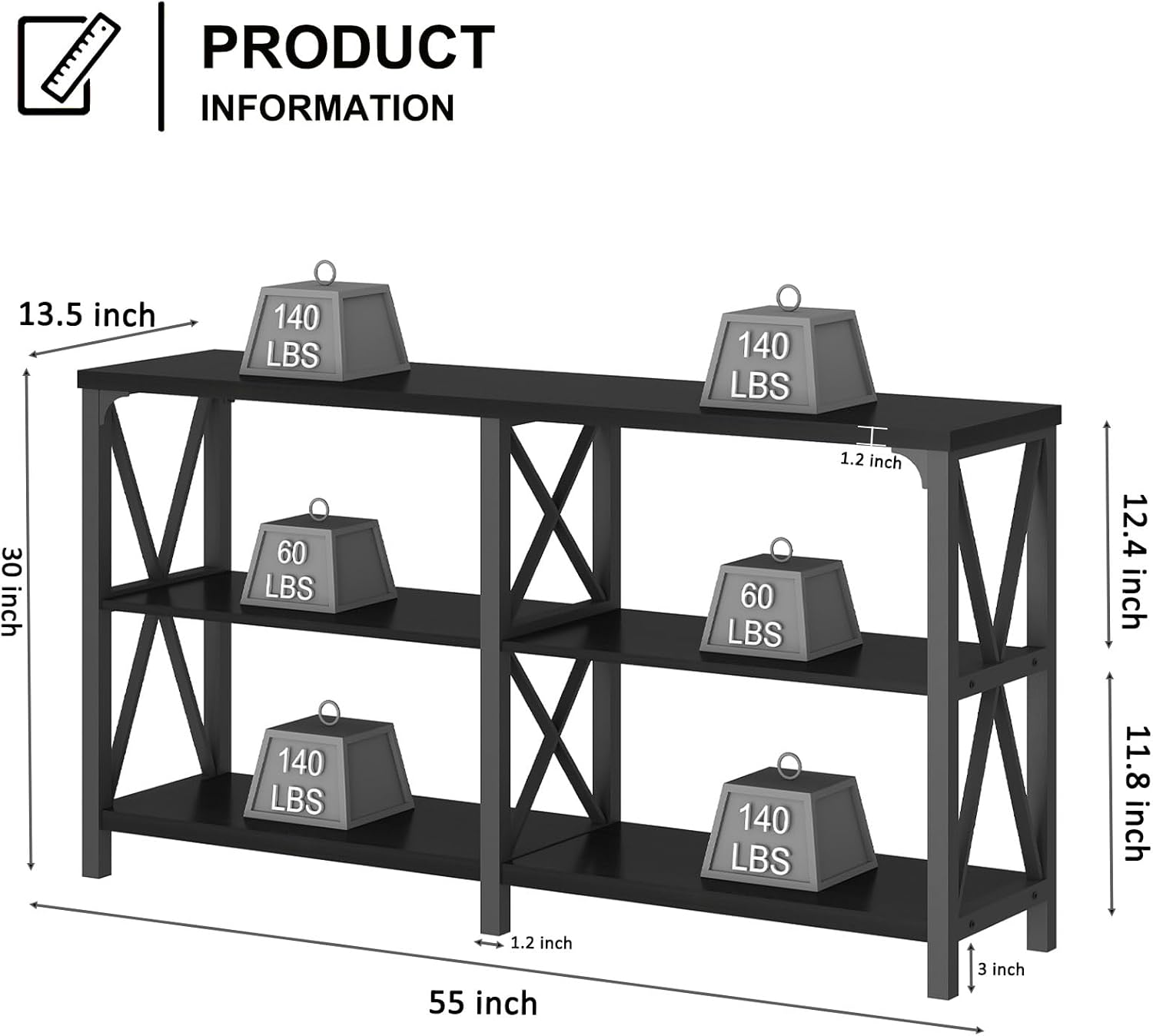 LVB Black Console Table, Modern Entryway Table with 3 Tier Storage Shelves, Industrial Sofa Table Behind Couch for Living Room, Farmhouse Wood Metal Entry Table for Hallway Foyer, Black Oak, 55 Inch