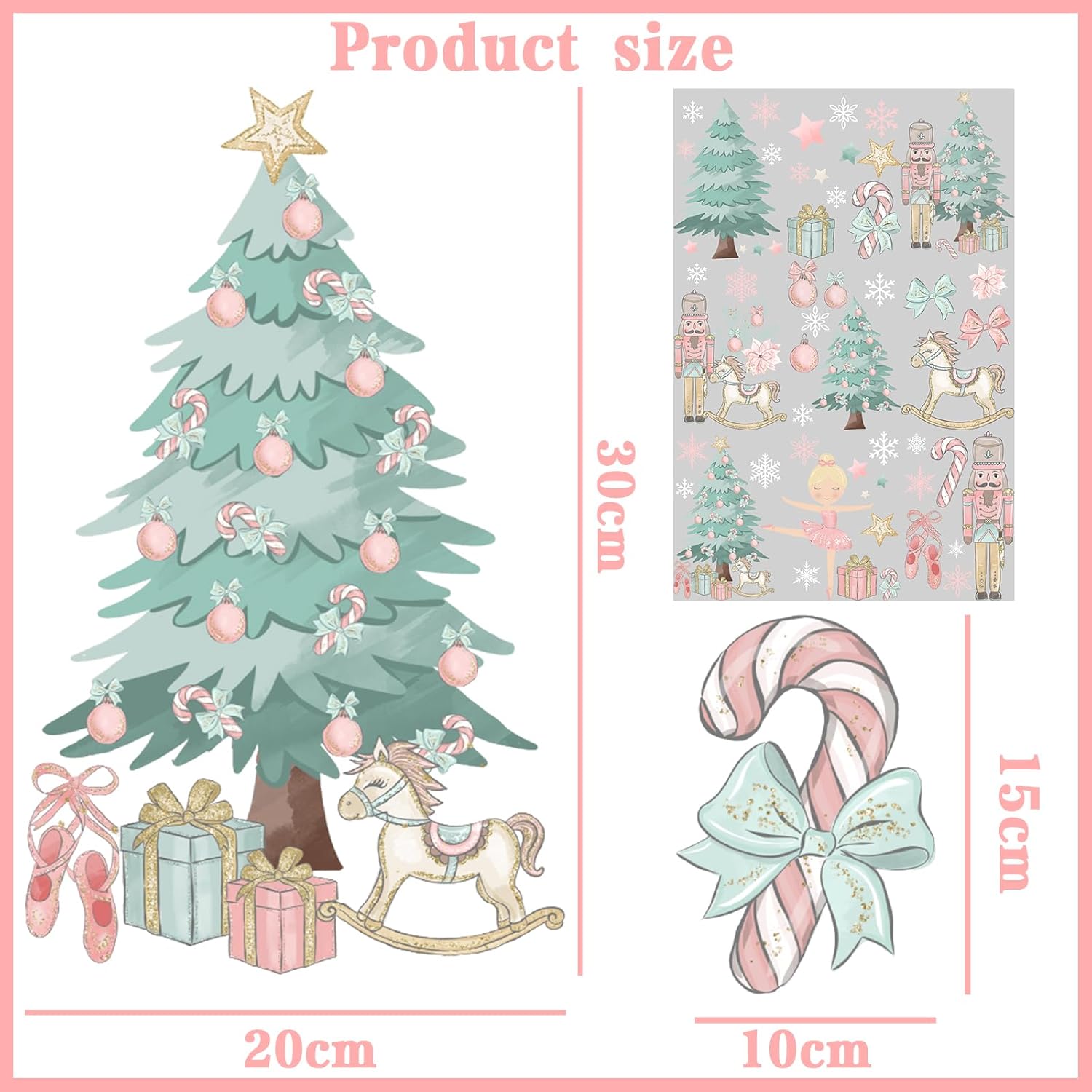 - 【PERFECT CHRISTMAS DECORATION】This pink nutcracke window stickers design with Christmas tree,nutcracke,ballerina,bells,bows,candy,snowflakes and other lovely Christmas elements.You can diy stick on the glass to add a strong atmosphere to your Christmas.Enjoy your party time.