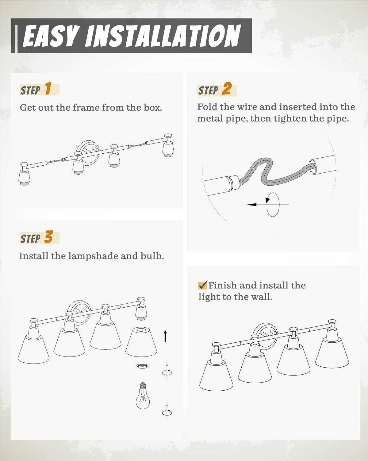 - [Farmhouse-inspired Design]: This farmhouse bathroom light fixtures has a black sturdy metal lamp body with a wood grain paint finish on top of the hammered metal shade, also the gold color inside makes the light shiny. Enhance the brightness and create a warm and cozy atmosphere in your bathroom.